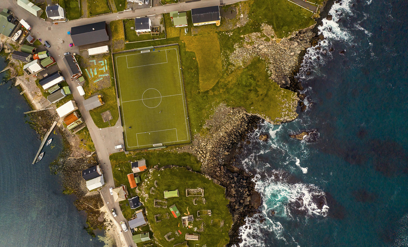 Am Nachmittag nehmen wir die Fähre zurück, um den Rest des Tages die Highlights der Nachbarinsel Eysturoy zu erkunden. Mit rund 10.000 Einwohnern und einer Fläche von 286 km² ist Eysturoy die zweitgrößte färöische Insel. Erstes Highlight ist das Fußballfeld in Eiði, auf dem im Sommer ein Campingplatz (mit schlechten sanitären Einrichtungen) ist. Ein tolles Fotomotiv ansonsten völlig überbewertet. Liebe Camper, übergeht diesen Platz.