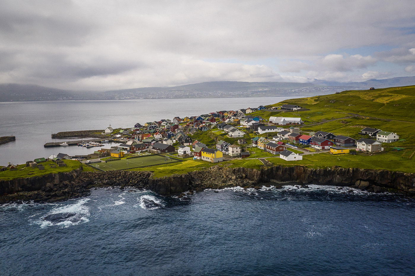 Hinter dem Ort befindet sich der höchste Berg Vágars, den Árnafjall (722 m). Bei schönem Wetter wie heute hast du freie Sicht.