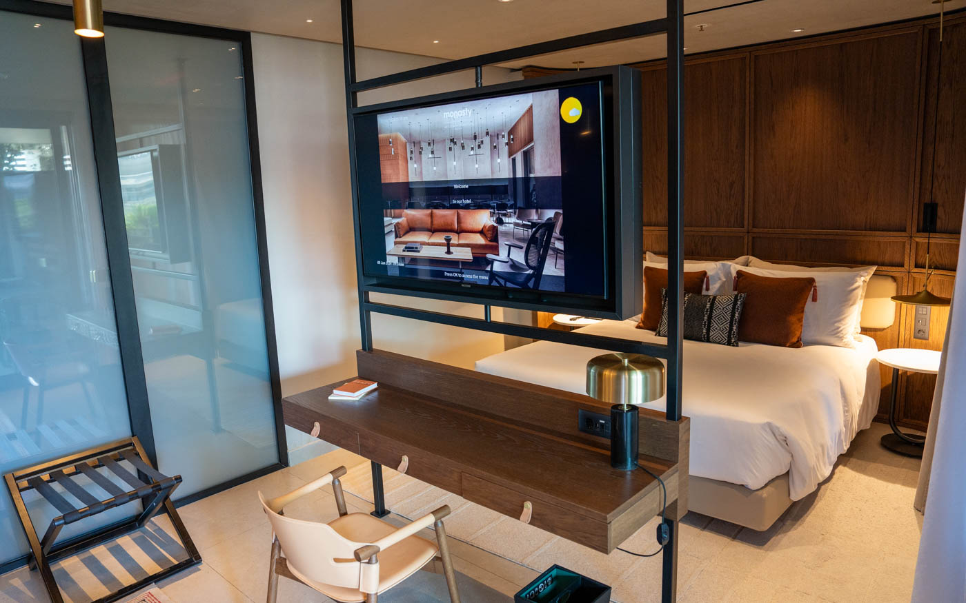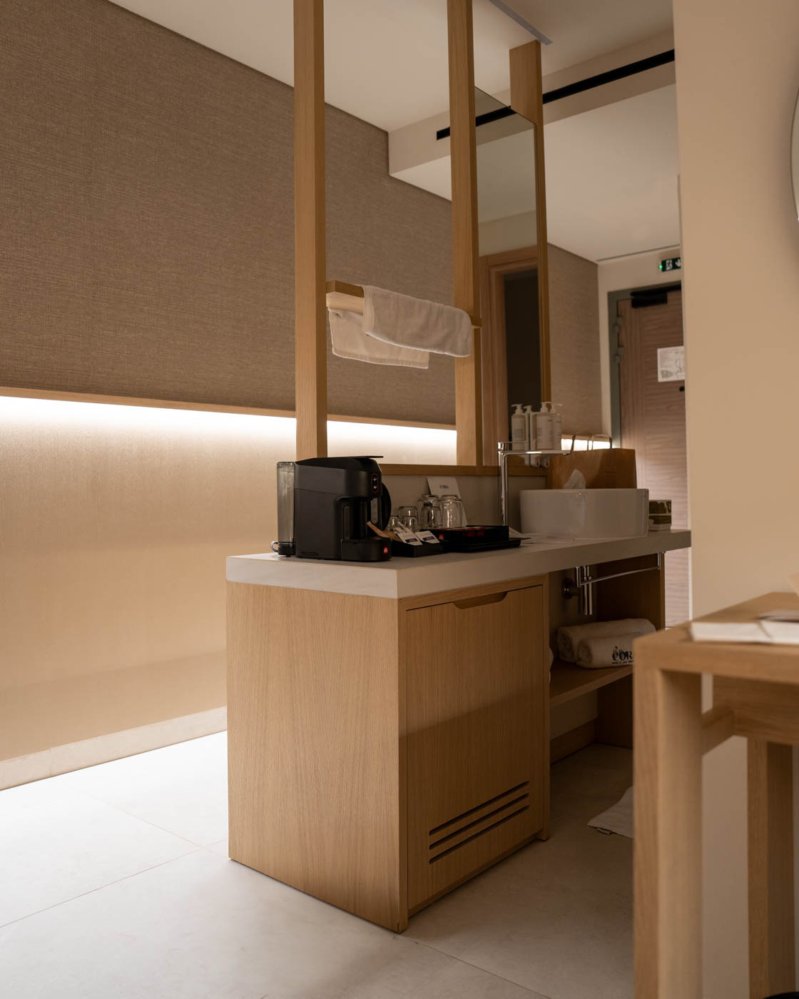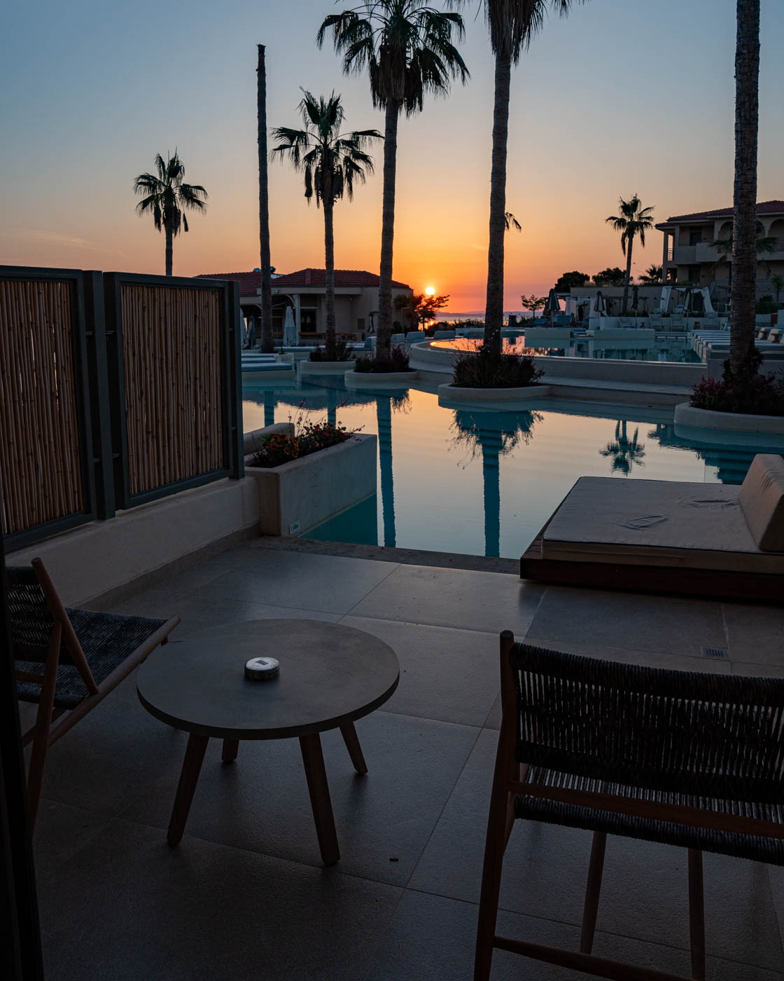 Mein Zimmer ist eher minimalistisch eingerichtet, von der Größe ausreichend. Es gibt eine Dusche, Minibar, Kaffeemaschine und eine separate Abstellkammer, die auch als Kleiderschrank dient. Hier kann man auch gut den Koffer verstauen. Das absolute Highlight aber ist die Terrasse mit Zugang zum Pool. Besonders beim Sonnenaufgang schwimmt es sich hier hervorragend. Aber auch nachts, wenn die öffentlichen Pools geschlossen sind, kann man sich so noch einmal abkühlen.