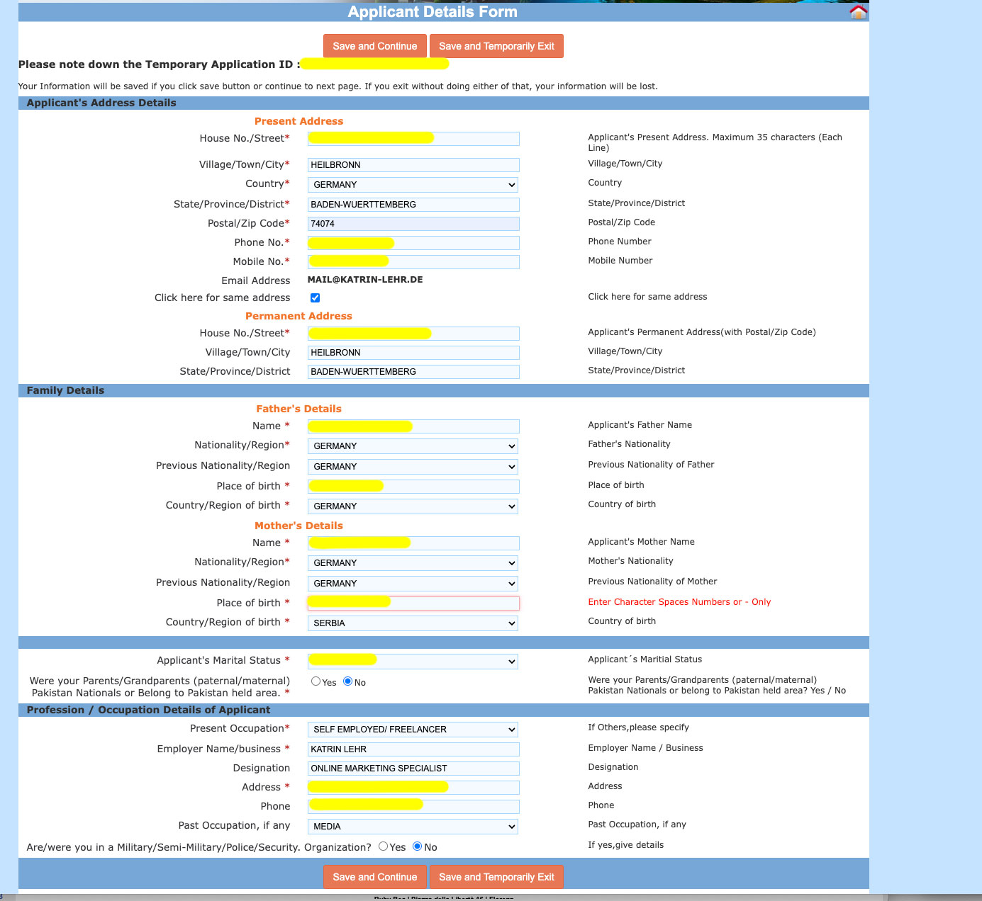 Im nächsten Schritt musst du genau aufpassen. Sonst darfst du von vorn beginnen. Notiere dir gleich die oben in Rot erscheinende ID unter Temporary Application ID (mit neongelb übermalt). Falls du abbrechen musst, kannst du anhand dieser ID später im Prozess weitermachen.