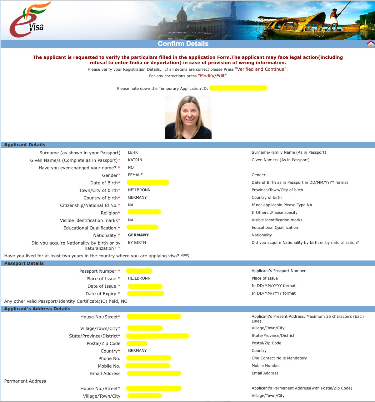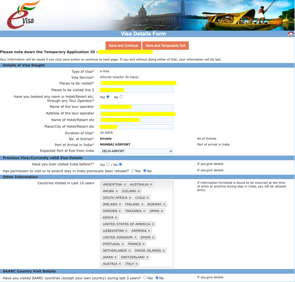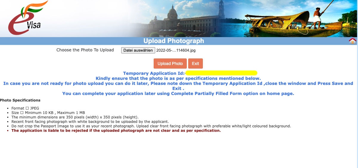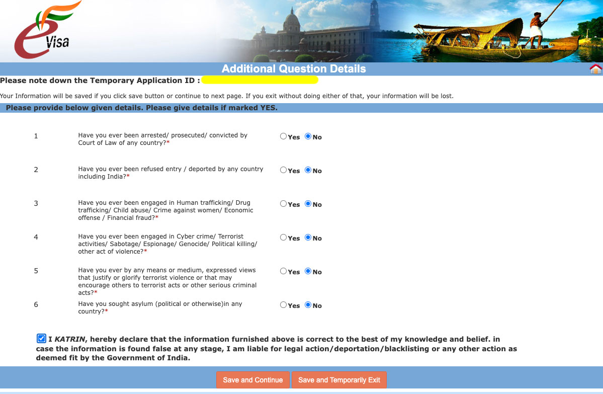 Ausstellungsort; Ausstellungsdatum (ich als Erstbesucherin werde mir die Daten direkt speichern) - Wurde dir ein Antrag zur Einreise nach Indien bereits einmal abgelehnt? Falls ja, wann und