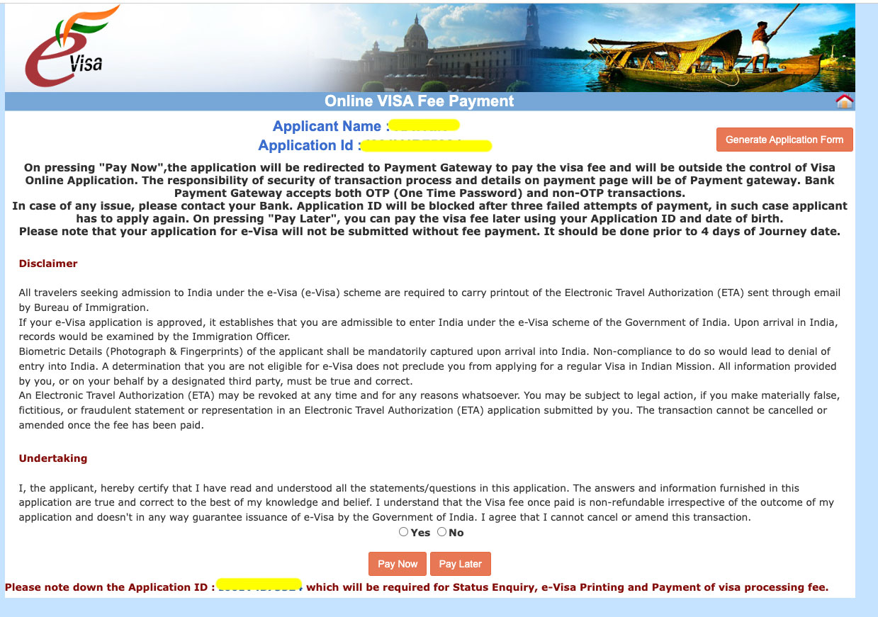 Jetzt geht’s ans Geld. Ohne Bezahlung kein Visum. Klicke unten zunächst auf YES. Wenn du gleich bezahlen willst (meine Empfehlung), dann klicke auf „Pay Now“, oder „Pay Later“, wenn du dies später erledigen möchtest. Ich habe zwar im Internet gelesen, dass du innerhalb 48 Stunden bezahlen musst, aber hier keine Informationen dazu gefunden.