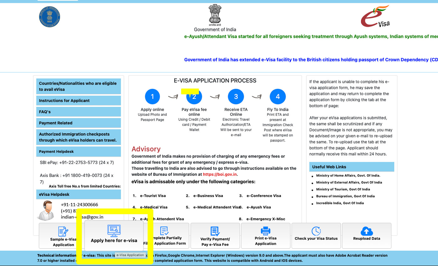Klicken Sie auf der Startseite des Government of India auf „Apply here for e-visa“ (im neongelben Kasten im Bild markiert), um deinen Antrag zu starten.