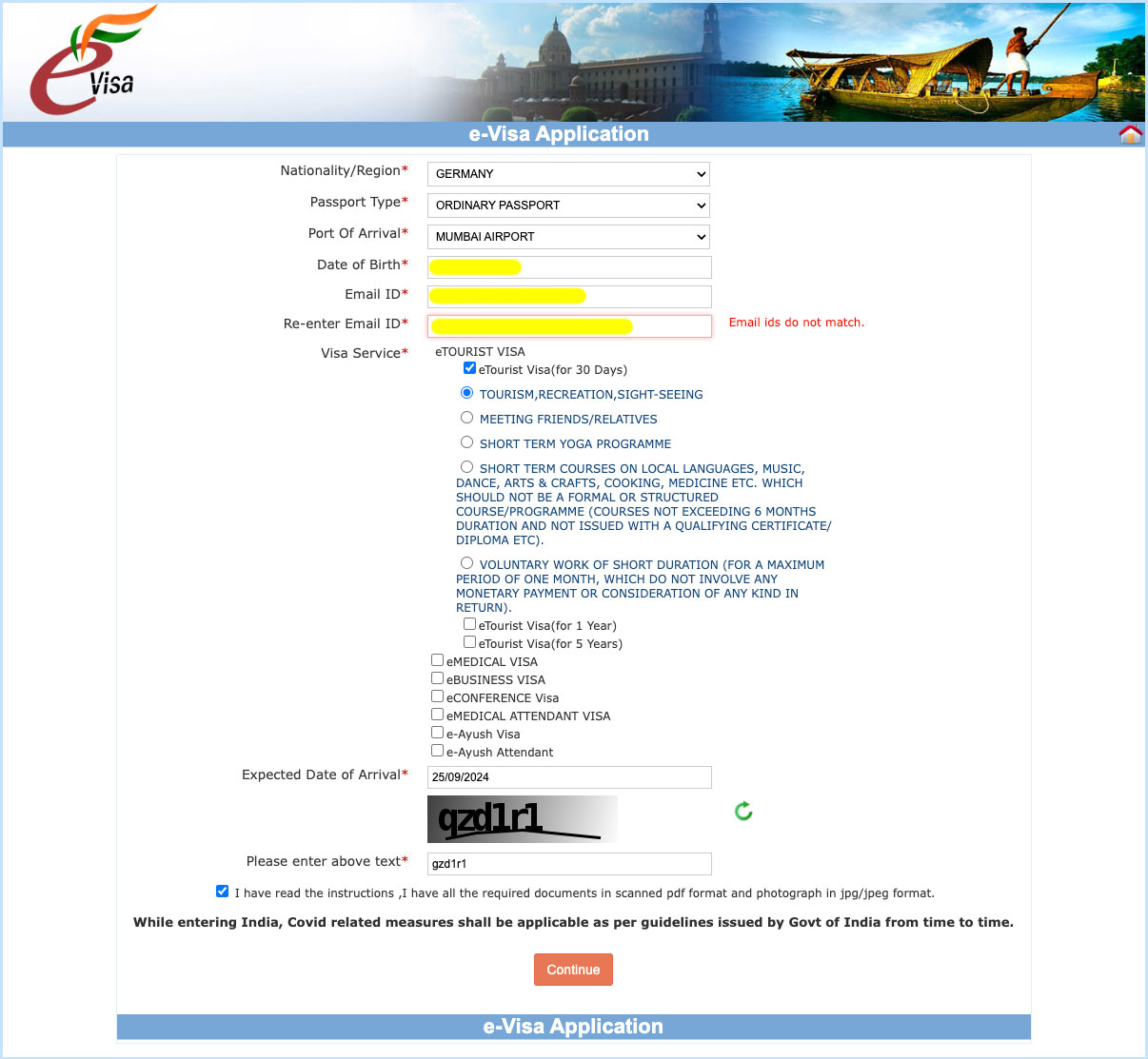 - Angabe eTourist Visa für 30 Tage; Tourism, Recreation, Sightseeing. Besuchst du Freunde oder Familie musst du dies auswählen