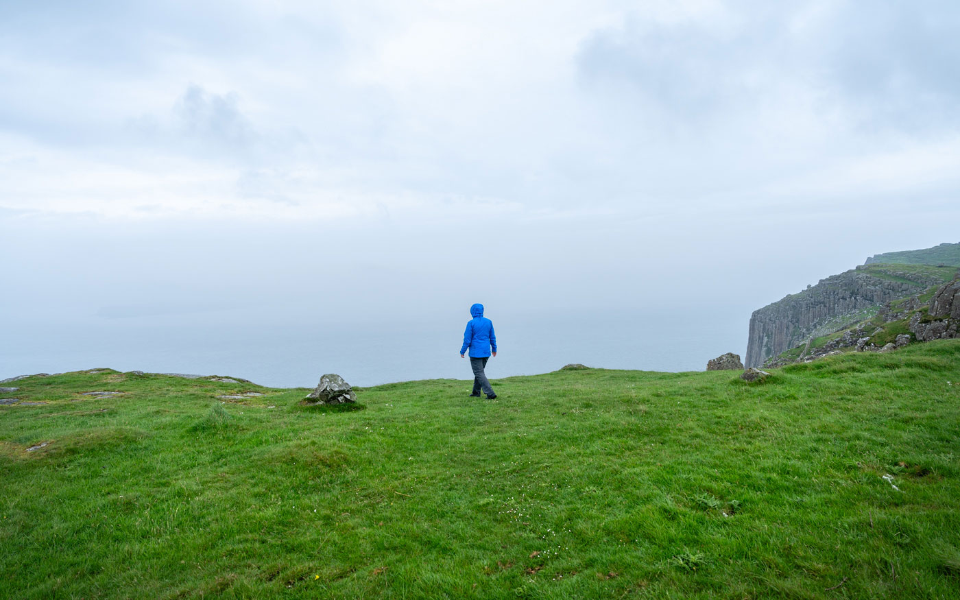 Warum? Fragen wir. „Wir haben schon viel Erfahrung gemacht und Leute sind gestolpert oder hängen geblieben“. Eine Bergung am Klippenpfad wäre nur übers Meer und die Küstenwache möglich. Daher die hohen Wanderstiefel. Hast du nicht das entsprechende Schuhwerk, kannst du dieses leihen oder umkehren.