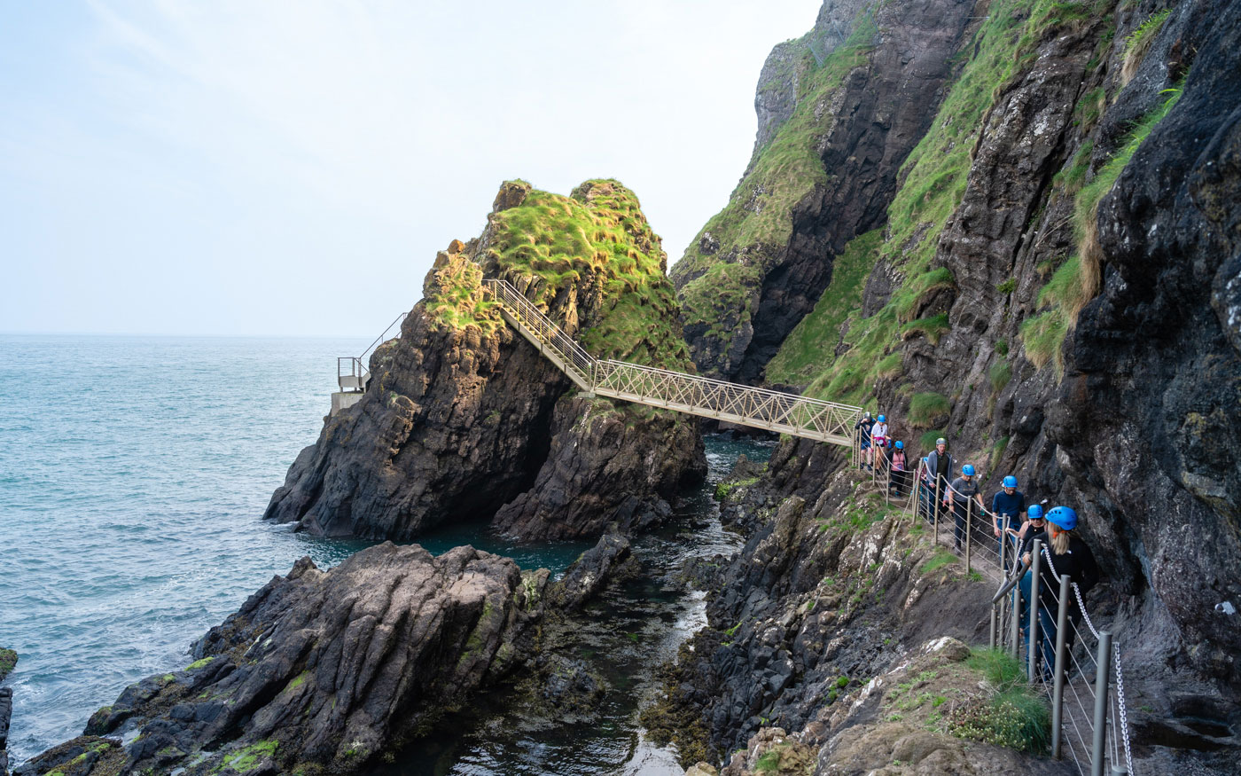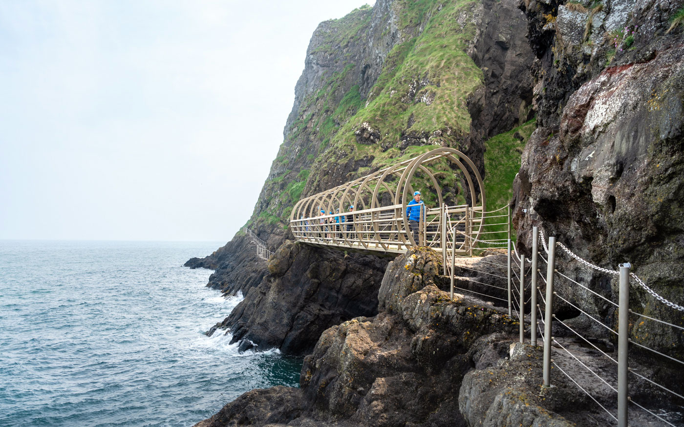 Nach einer kurzen Weiterfahrt erreichen wir das Besucherzentrum zu „The Gobbins“. Ein absolutes Highlight entlang der Causeway Coastal Route. Auch eines, mit strengen Regularien: kein Rucksack, keine Taschen, keine 360° Kamera (mit Stick), nur mit Wanderstiefeln und Kamera. Eine Flasche Wasser wäre ebenfalls erlaubt.