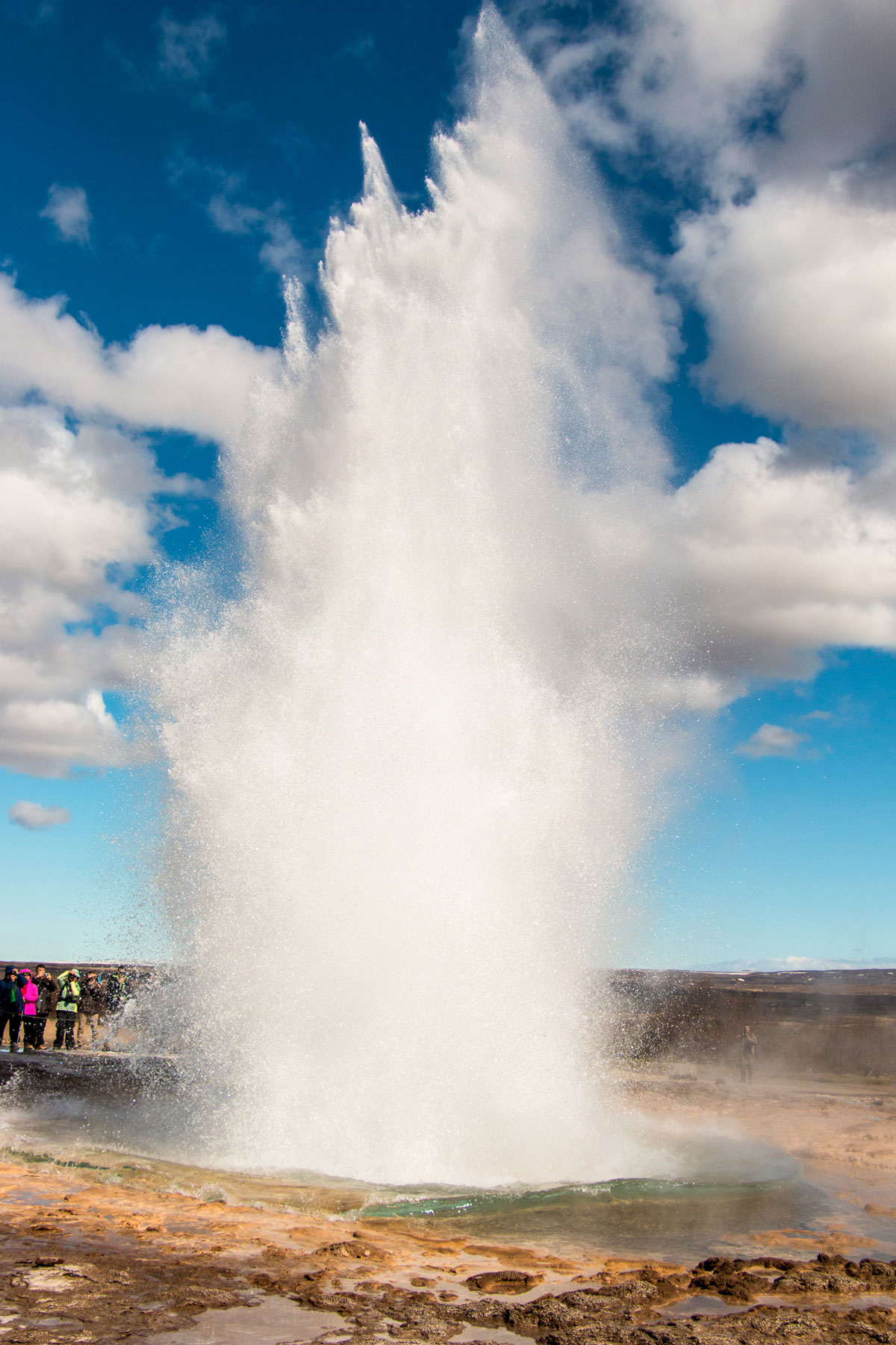 Aber keine Sorge, die Gegend um den Großen Geysir ist immer noch ein faszinierender Ort voller geothermischer Wunder. Ein paar Meter weiter ist der Strokkur Geysir. Er ist zwar kleiner, dafür sorgt er in regelmäßigen Abständen (bei uns alle 8 bis 10 Minuten, manchmal eher) für ein beeindruckendes Schauspiel, wenn die Fontäne aus heißem Wasser laut tosend nach oben schießt. Das ist beeindruckend und lässt Besucher die Kraft der isländischen Natur hautnah erleben. So manch einer erschrickt, wenn plötzlich die Fontäne nach oben schießt.