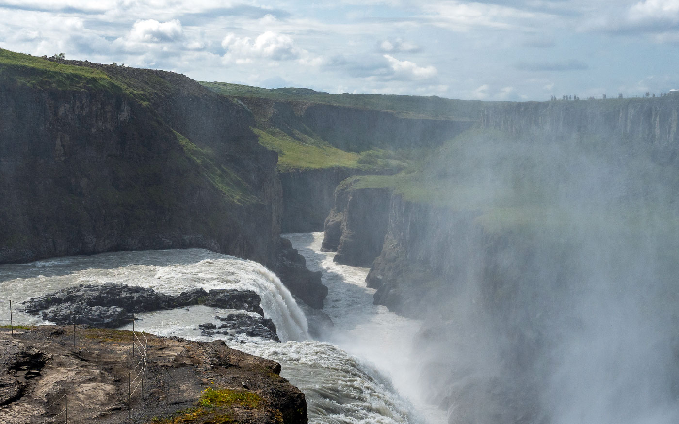 Aus rund 30 m Höhe fallen die Wassermassen des Flusses Hvirta hier auf zwei Ebenen laut tosend in die Tiefe. Zieh dir deine Regenjacke an, es könnte nass werden. Gullfoss bedeutet übersetzt "Goldene Wasserfälle" nach dem goldenen Regenbogen, der sich bei Sonnenschein (vor allem im Sommer) oft über der Schlucht bildet.
