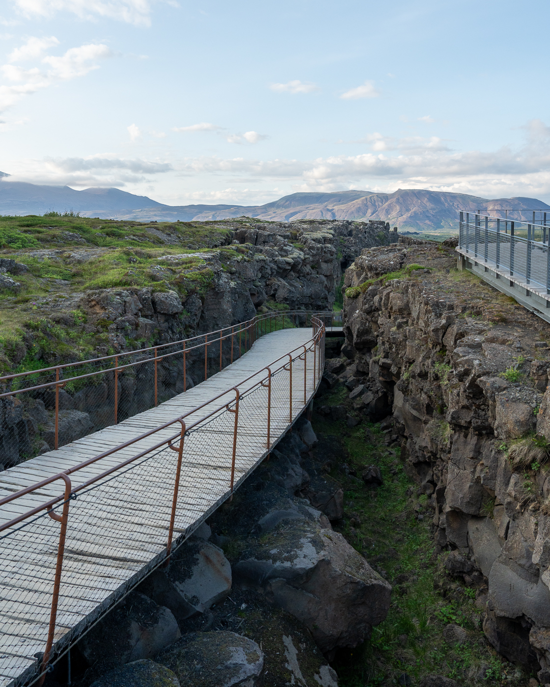 Von hier aus führen Fußwege hinab in die Spalten zwischen den Kontinentalplatten und vorbei am Öxarárfoss Wasserfall.