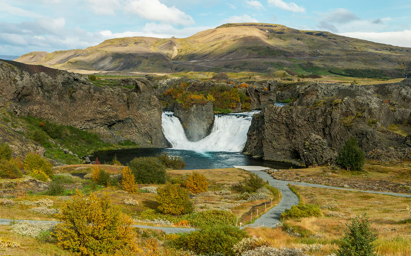Das Þjórsárdalur-Tal ist noch von großen Touristenmassen verschont worden und somit fast noch ein Geheimtipp. Im Tal findest du wunderschöne Wasserfälle. Einer davon befindet sich in der spektakulären Gjáin-Felsenschlucht. Der Háifoss-Wasserfall – mit 122 Metern Islands dritthöchster Wasserfall – und der Granni-Wasserfall sind auch zwei kaum bekannte Highlights in Island. Ein weiterer Wasserfall ist der Hjálp (Hilfe), ein paar Meter weiter. Es gibt noch weitere Wasserfälle und dazu diese typischen Holzhäuser mit Moosdächern.