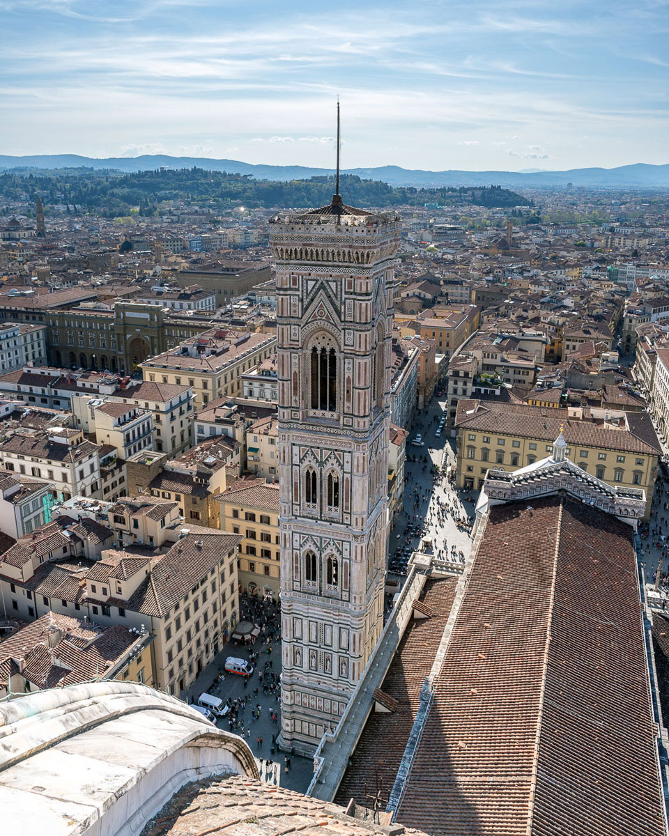 Der als "Giottos Glockenturm" bekannte Campanile des Doms von Florenz wurde vom bedeutenden Meister des 14. Jahrhunderts konstruiert. Er verkörpert auf eindrucksvolle Weise die Merkmale der florentinischen gotischen Architektur, bei der die Proportionen des Turms – beeindruckende 84,70 Meter Höhe und 15 Meter Breite – in einer perfekten Harmonie von Giotto di Bondone gestaltet wurden.