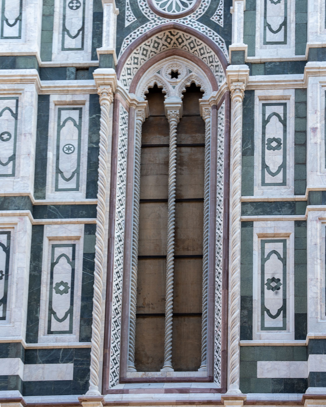 Hinweis: Wissenswert ist, dass die ursprüngliche Fassade von Arnolfo di Cambio (der auch den Turm des Palazzo Vecchio erbaute), nie über den Türen fortgesetzt wurde. Auf Anordnung von Großherzog Francesco I. de' Medici wurde sie 1587 entfernt. Denn er wollte unbedingt eine Fassade im Renaissancestil. Vor der Änderung wurde von Bernardino Poccetti eine Zeichnung erstellt, die in einer Kopie aus dem 18. Jahrhundert im Archiv im Museum Opera di Santa Maria del Fiore aufbewahrt wurde. Auf deren Grundlage wurde ein Holzmodell im Hauptraum des Museums erstellt.