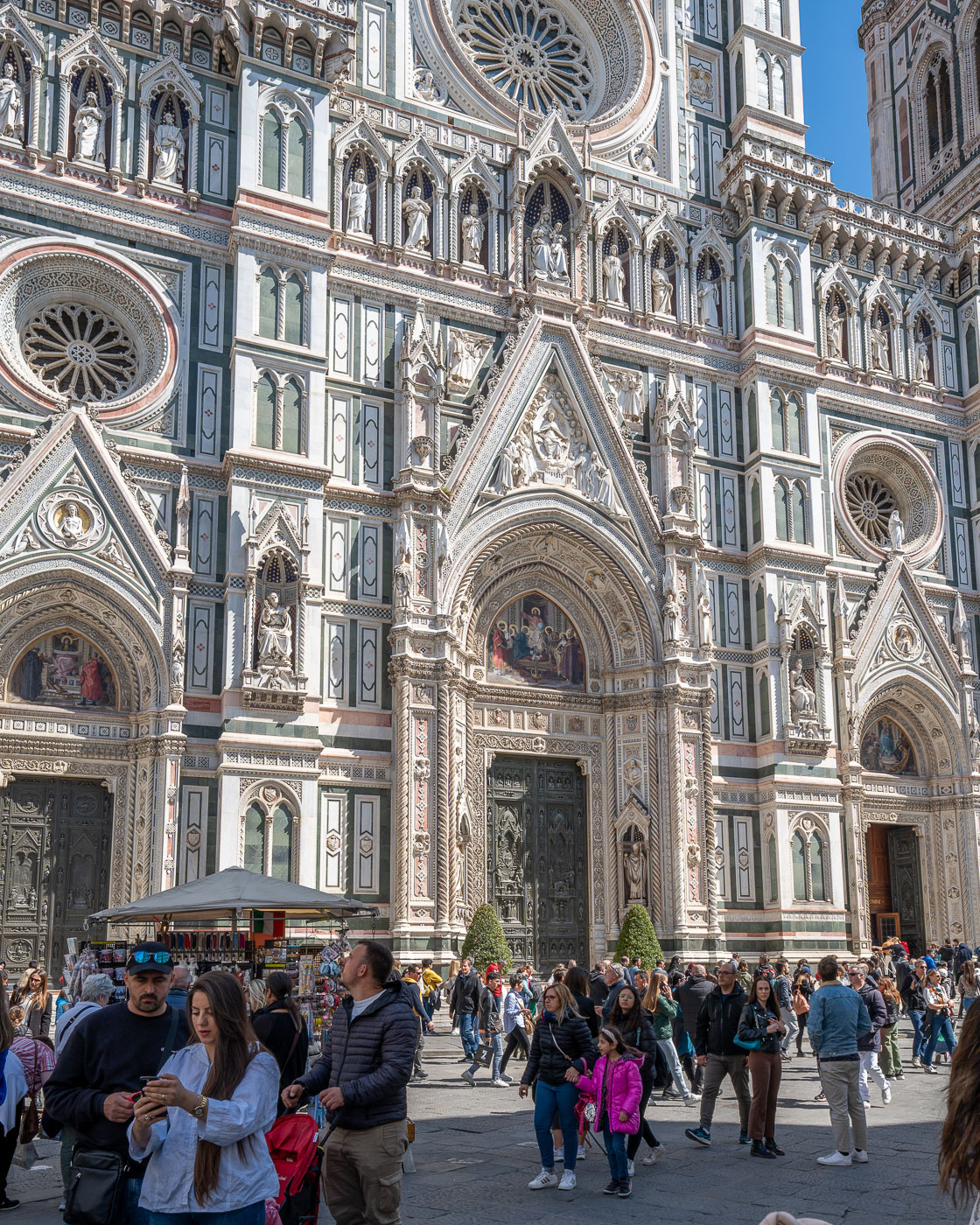 Die Fassade des Doms ist sehr umfangreich: Ganz oben ist Jesus zu sehen. Direkt darunter nicht seine Apostel, sondern berühmte Florentiner Künstler. Erst darunter folgen Maria mit Kind sowie den Statuen der Apostel. In den vier Pfeilern sind die Bischöfe und Papst Eugen IV. zu sehen, der die Kirche 1436 weihte. Ohne unsere Tour bei Guru Walk hätten wir das interessante Detail mit den Florentiner Künstlern nicht erfahren (obwohl es im Baedeker Smart Reiseführer für Florenz steht, allerdings ohne Hinweis, dass diese Art der Anordnung etwas Besonderes ist).