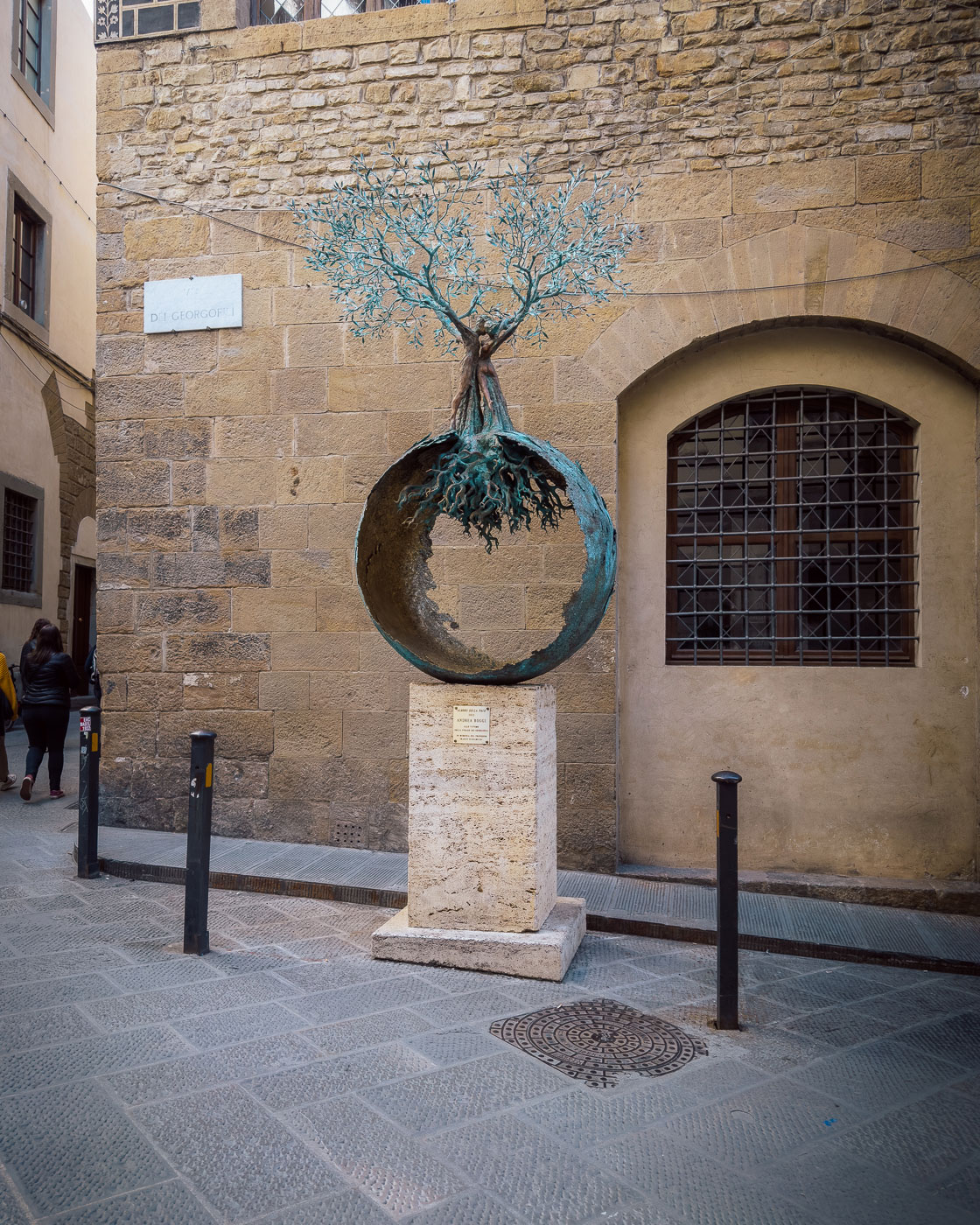 Die Bombe in Florenz war gegen die Uffizien gerichtet. Fünf Menschen kamen dabei ums Leben, 41 Menschen wurden verletzt, wichtige Kunstwerke wurden zerstört oder schwer beschädigt. Als Andenken für die Toten wurde in der Via dei Georgofili stehen hier zwei Statuen. Ein Lebensbaum und bei einem Blick nach oben rechts sieht man einen Jungen an der Hauswand.