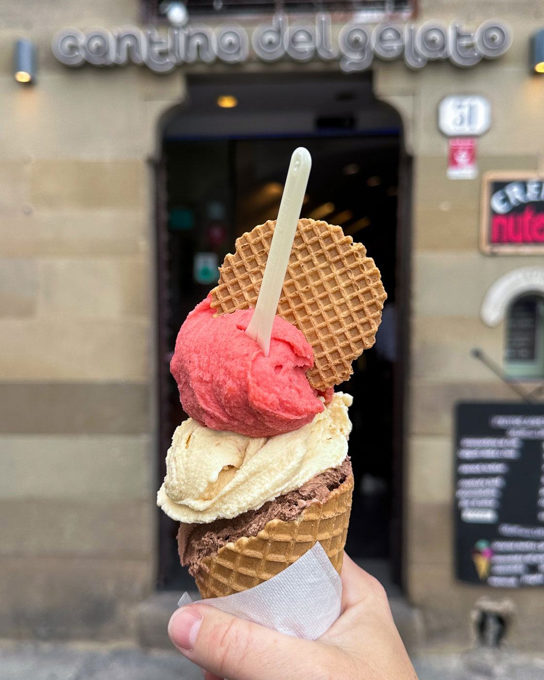 Wir haben unser Programm klar durchgezogen: Ein Eis am Tag ist auf einer Toskana Rundreise Pflicht. Daher haben wir weitere Eisdielen getestet und uns noch einen persönlichen Geheimtipp von Eva, die Expertin unserer Food-Tour, eingeholt. Das Eis der Eisdiele Cantina del Gelato ist hervorragend. Auch qualitativ sehr zu empfehlen, das Eis bei La Sorbettiera. Beide befinden sich auf der anderen Seite des Arno Flusses.