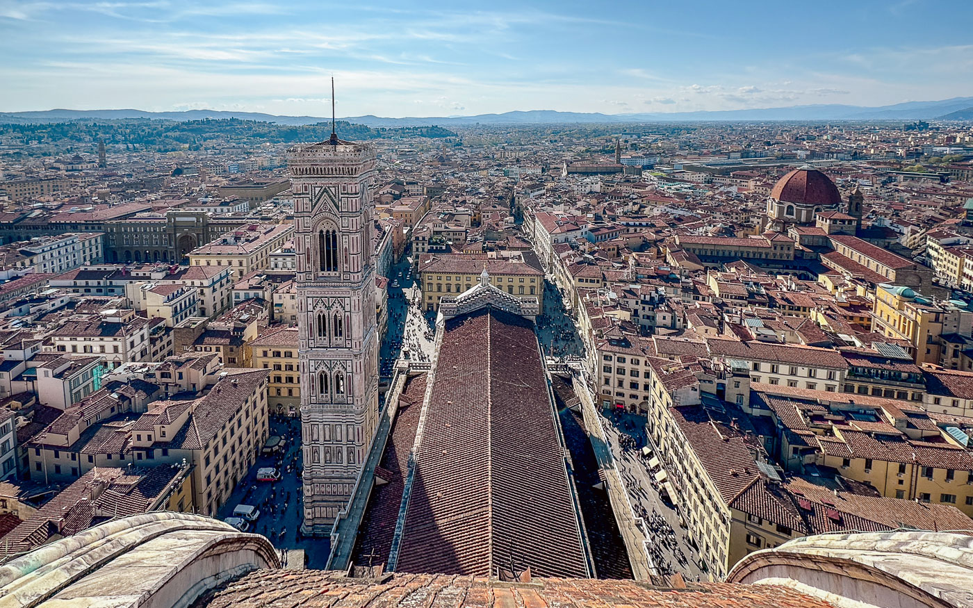 Bereits aus der Ferne erkennst du die riesige Domkuppel von Florenz. Die Ansicht ist einzigartig. Der Domplatz samt Dom, Baptisterium (Taufkirche), Campanile (Glockenturm) und dem Museum bilden das Zentrum des historischen Zentrum und UNESCO-Weltkulturerbe.