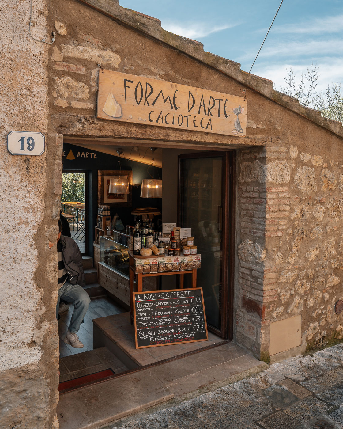 Wir müssen nicht erst Google Maps befragen, wo die Metzgerei und der Imbiss von Dario sich befinden. Genau da, wo viele Menschen sind. Natürlich bekommen wir im Restaurant „Officina“ – zu Deutsch Werkstatt – keinen Platz. An die Metzgerei grenzt eine Art Fanshop an, in dem der Chef persönlich für Fotos gegen Gebühr bereitsteht. Wir gehen zum Imbiss, ich wähle ein Panino con pastramino e senape. Wir bekommen einen Appetizer zum Probieren eines anderen Gerichts. Danach folgt mein Panino. Es ist göttlich.