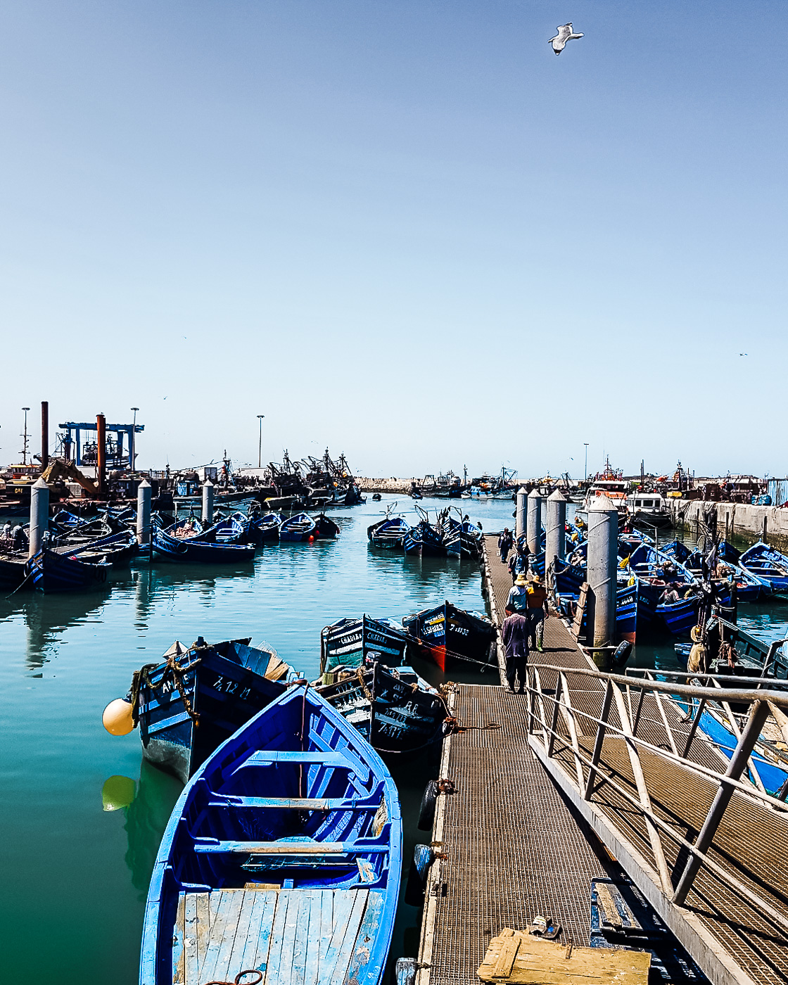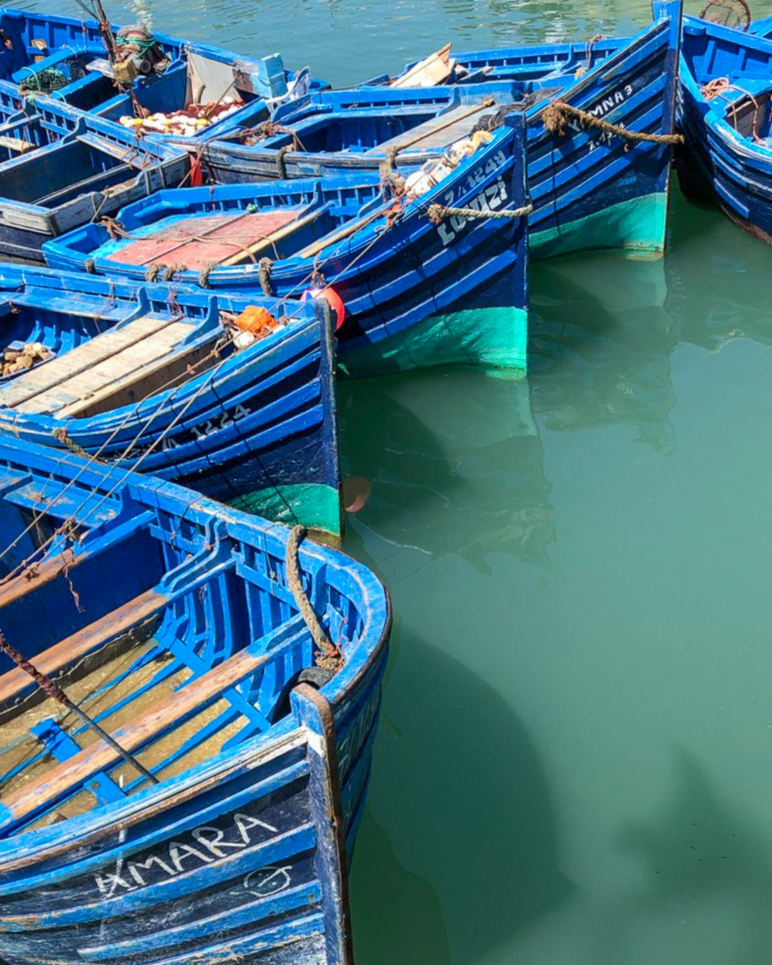 Unmittelbar an die Medina anschließend findest du den Platz Moulaiy Hassan und den Fischmarkt. Als Hafenstadt beherbergt Essaouira einen lebendige Fischerei-Szene. So wird hier tagtäglich der frischeste Fisch gefangen und direkt in den, an den Fischermarkt angrenzenden, Restaurants vertrieben und zubereitet. Am Hafen kannst du auch einen Blick auf die traditionell in blau gehaltenen Fischerboote werfen, die auch heute noch bei dem Ein oder Anderen zum Einsatz kommen.