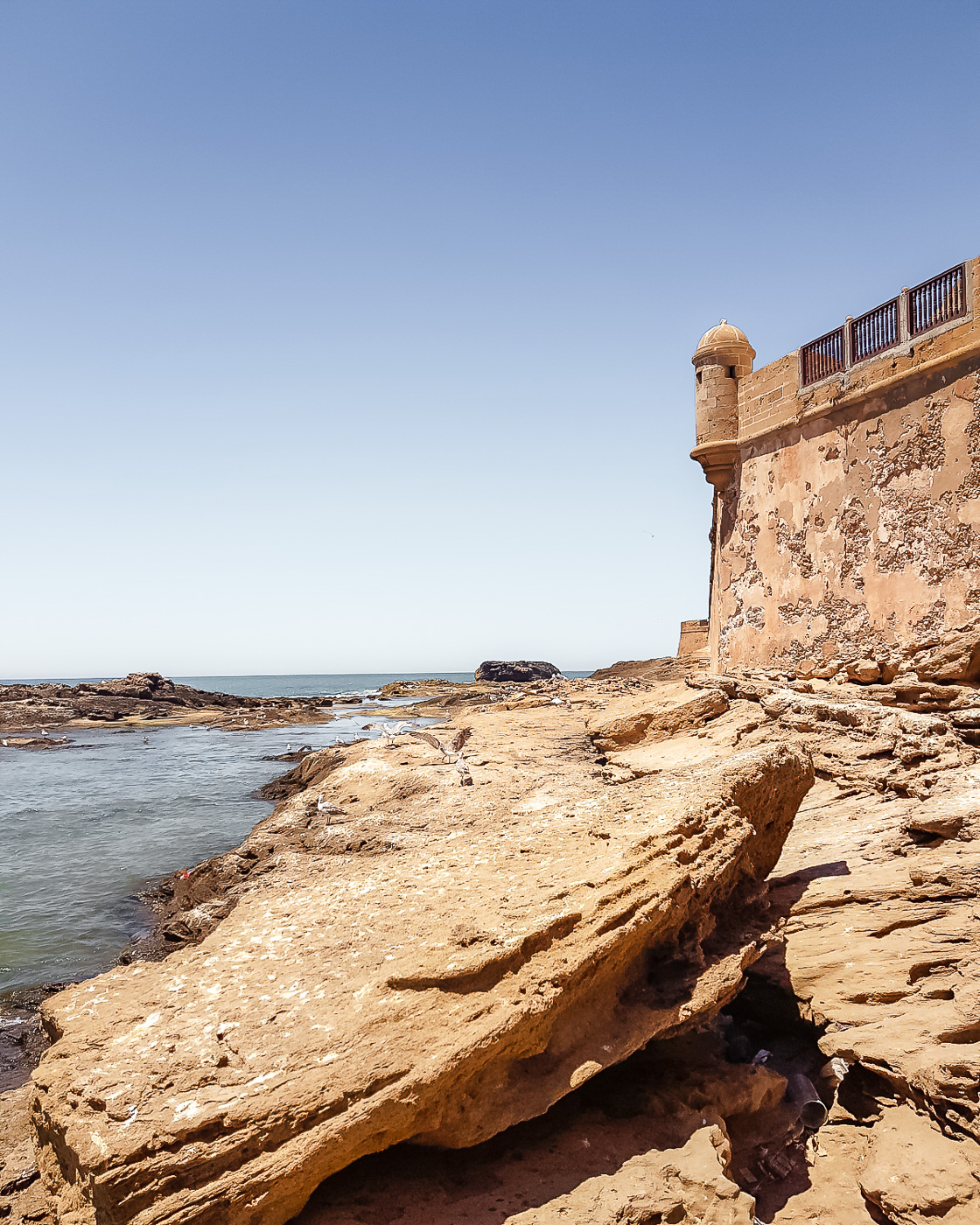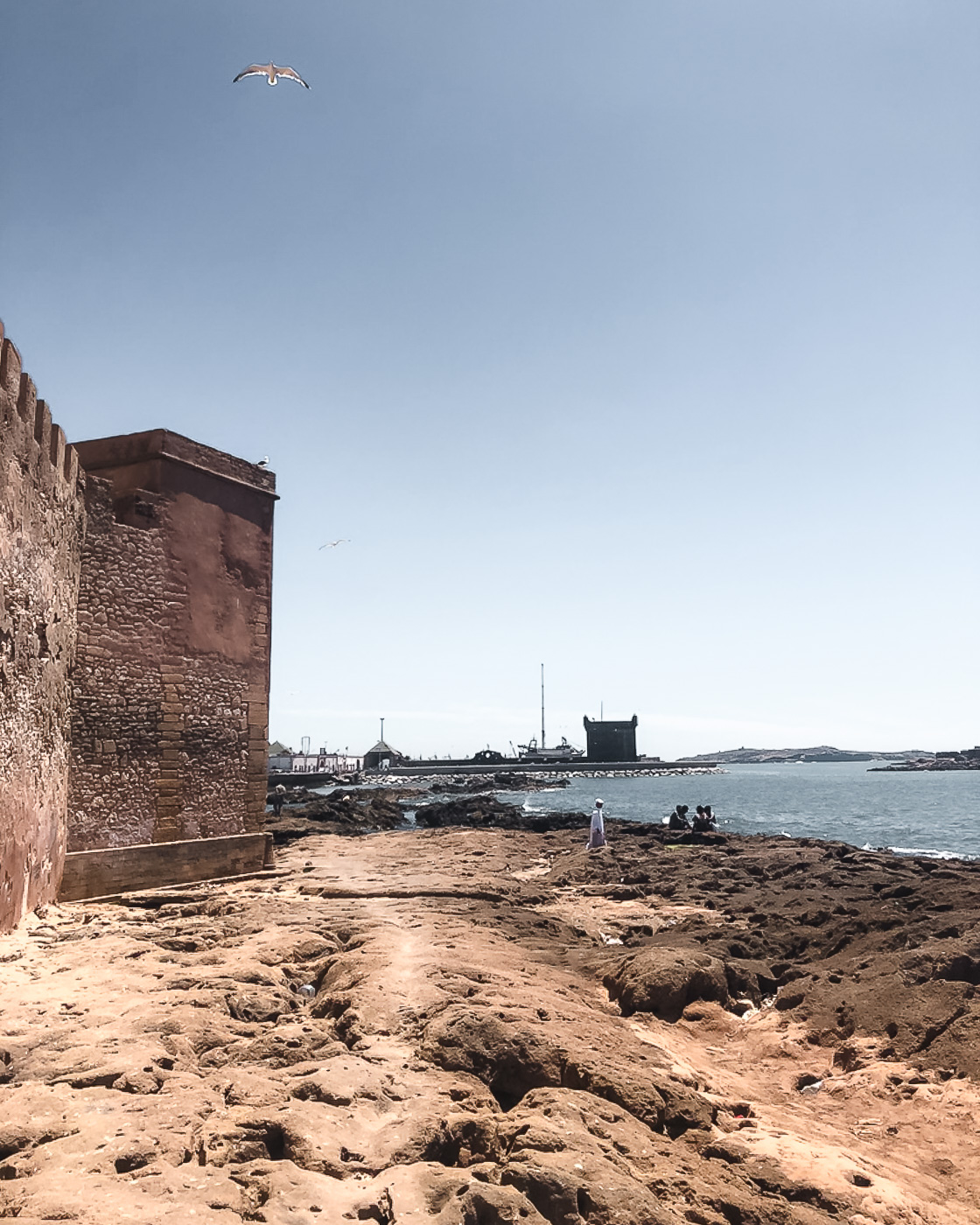 Aber die Stadtmauern sind auch von außerhalb der Medina zu bestaunen. Vom Moulaiy Hassan Platz kannst du zur kleinen Mauer Richtung Meer gehen. Hier ist ein Gate, dass dir den Weg zu den Felsen freilegt. Von hier kannst du einfach immer unterhalb der Mauer lang spazieren und gelangst so zu verschiedenen Felsvorsprüngen, an denen du einen perfekten Blick auf die Wellen des Atlantiks erhaschst.