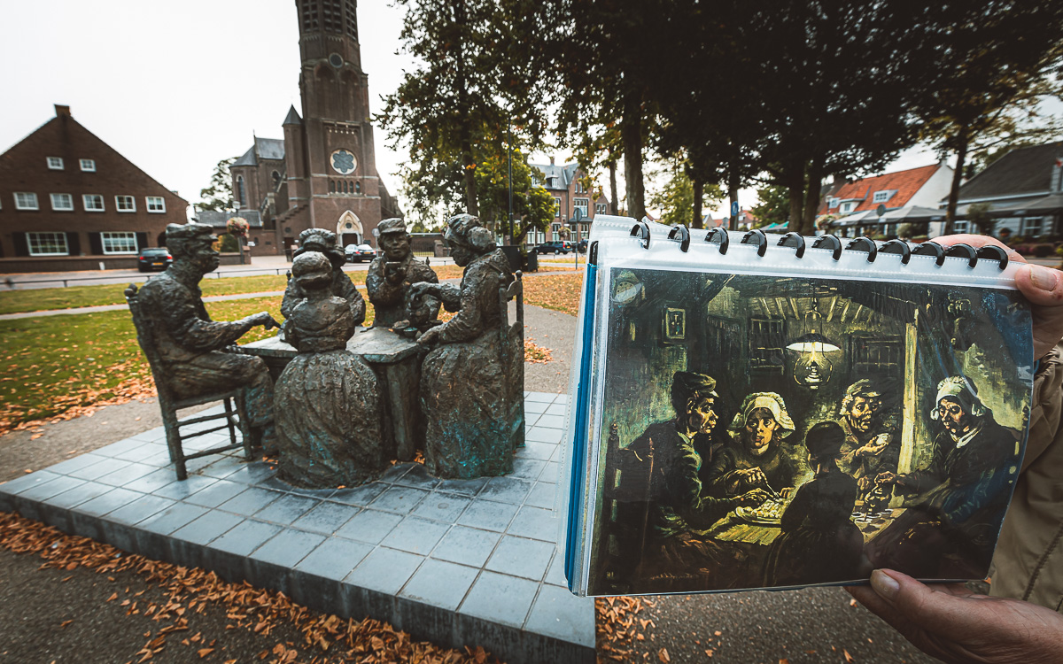 Darunter die Van Gogh-Kirche, das einstige Wohnhaus der Eltern, sein Denkmal als auch eine Abbildung der Kartoffelesser im Zentrum von Nuenen nahe der Stelle, an der das Bild finassiert wurde.