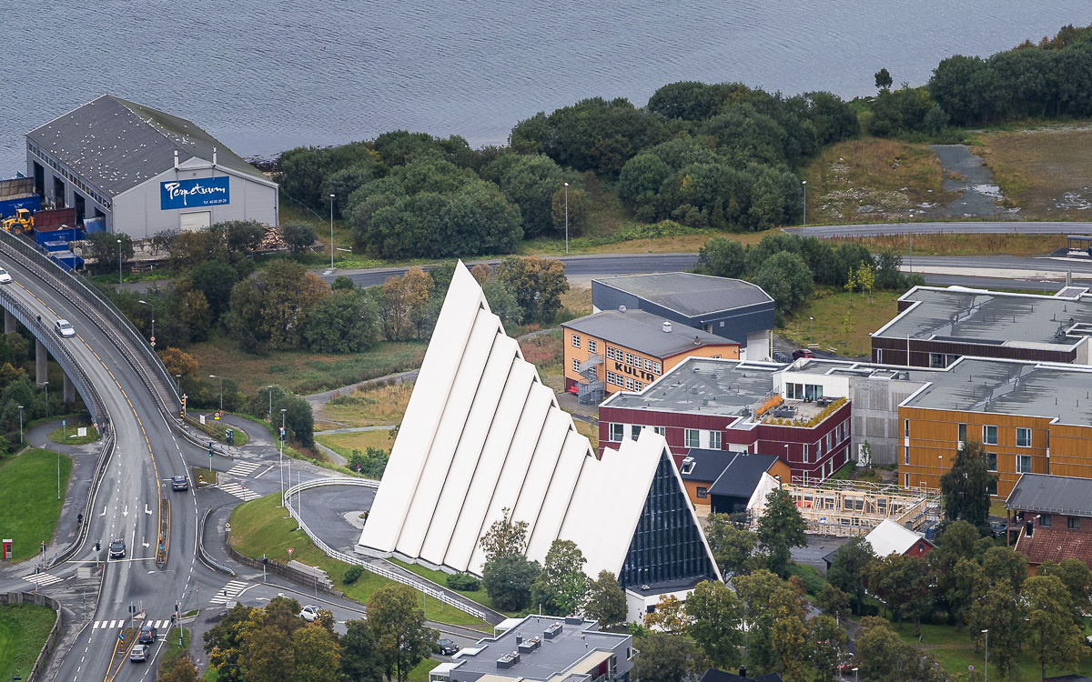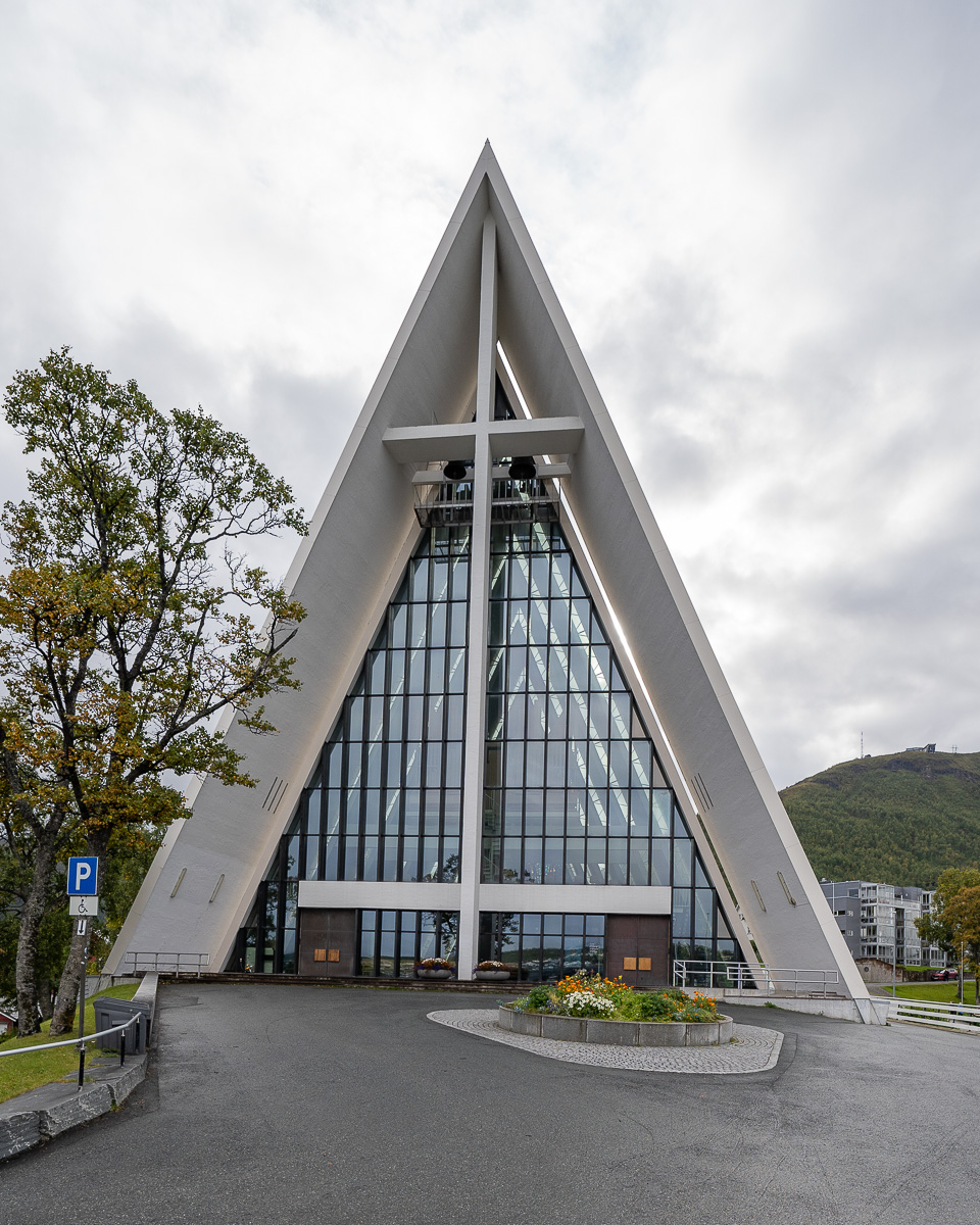 Auf dem Rückweg von der Seilbahn kommst du am markantesten Gebäude Tromsøs vorbei: Der Eismeerkathedrale (Ishavskatedralen), nördlichste Kathedrale der Welt. Das Wahrzeichen von Tromsø hat nur einen Nachteil: Nach Ende der Sommerferien in Norwegen ist Nebensaison. Ab September ist die Eismeerkathedrale daher nur noch für wenige Stunden am Tag geöffnet. Prüfe daher auf der Webseite, wann die Kathedrale am Tag deines Besuchs geöffnet ist (Webseite).