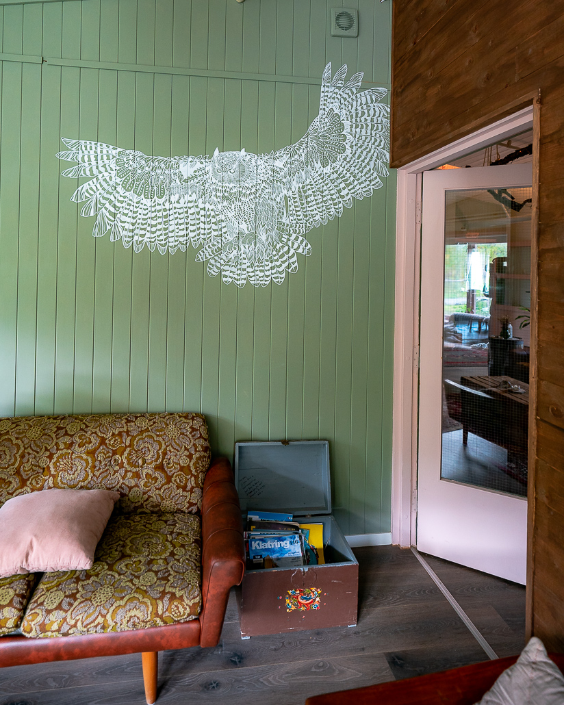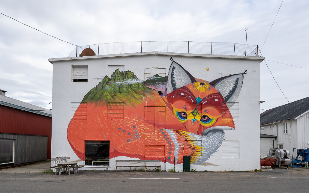 Weiter geht es der Straße entlang (nicht denselben Weg zurück), um eines der coolsten Fotomotive der Lofoten zu finden. Ein altes, fast verfallenes Haus mit Street-Art, auf dem sich der norwegische Street-Artist Pøbel verewigt hat (Google Maps "Butterfly House"). Allerdings kannst du hier nur an der Straße parken. Es gibt sonst leider keine Möglichkeit.