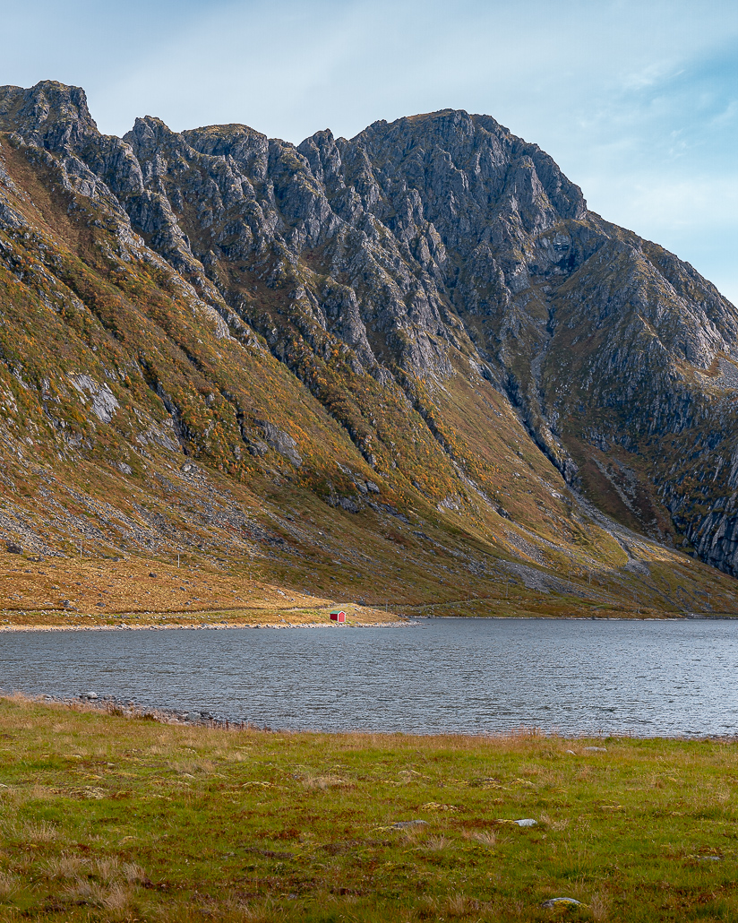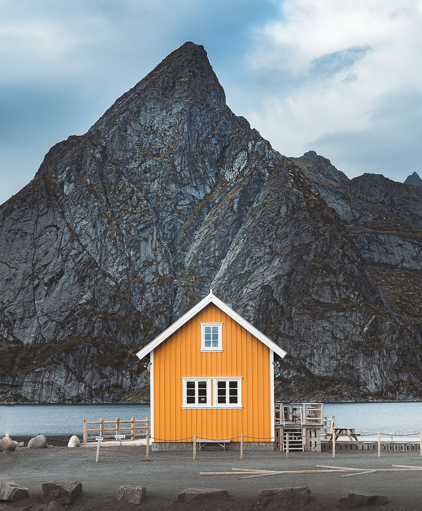 Hast du auf diesem Parkplatz geparkt, kannst du jetzt in die andere Richtung zur kleinen Insel Toppøya für weitere Fotomotive auf Hamnøy gehen. Dazu gibt es von einer kleinen Anhöhe einen weiteren tollen Spot mit Blick auf eine Lagerhalle/rotes Rorbuer Haus und den markanten Bergen im Hintergrund. Dann setze ich meine Fahrt fort bis Sakrisøy.
