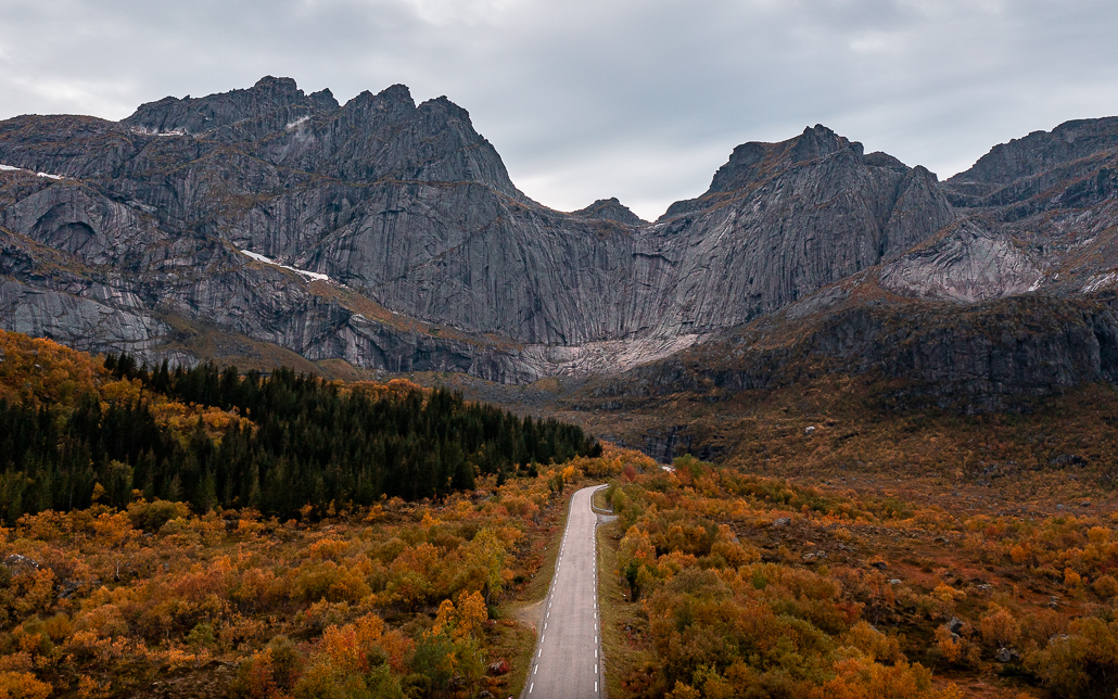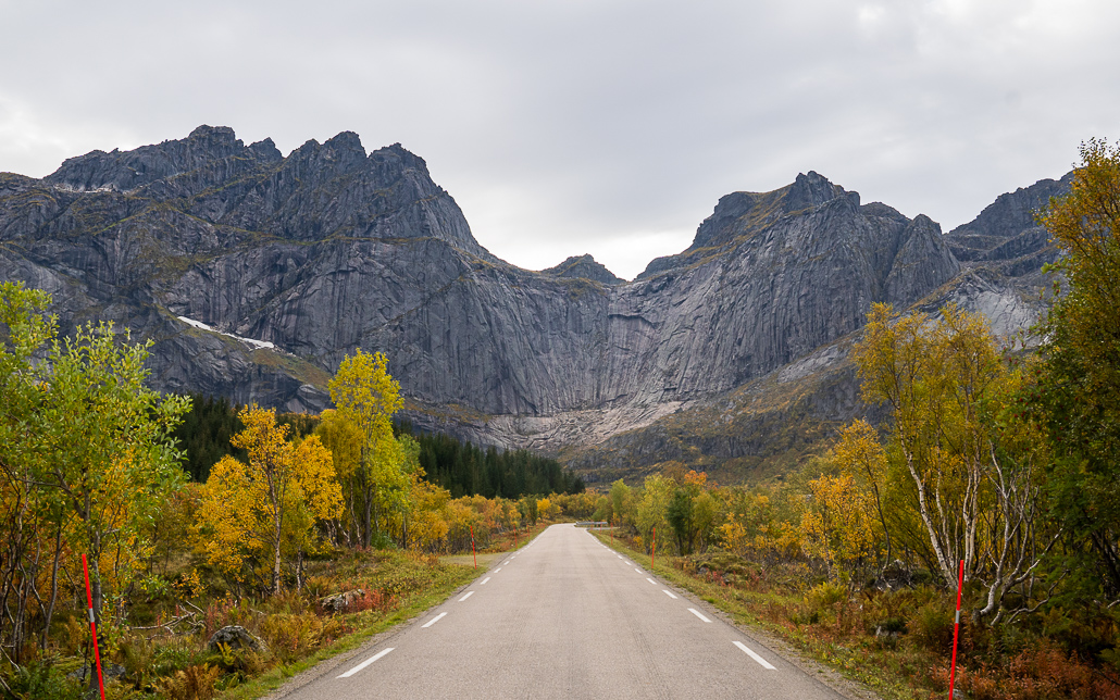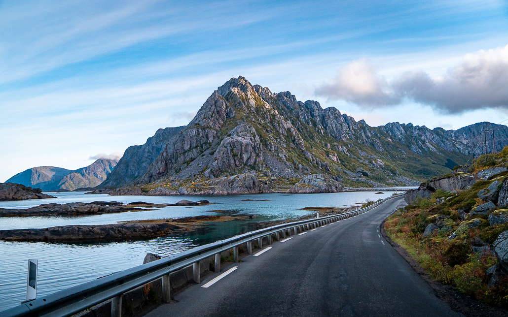 Nachdem ich Vesterålen und vor allem Andenes mit Whale Watching erlebt und erkundet habe, fahre ich mit meinem Wohnmobil vom Norden her kommen auf die Lofoten. Es ist schon später Nachmittag im Herbst und es regnet. Die Fähre von Melbu nach Fiskebøl fährt nicht (oder erst später), so fahre ich mit dem Camper auf der E10 in Raftsundet über die Raftsund-Brücke auf die Lofoten. Hier beginnt auch die Nationale Touristenroute Lofoten. Ein Stück geht es entlang der Küstenlinie und durch den Unterwassertunnel Sløverfjordtunnelen.
