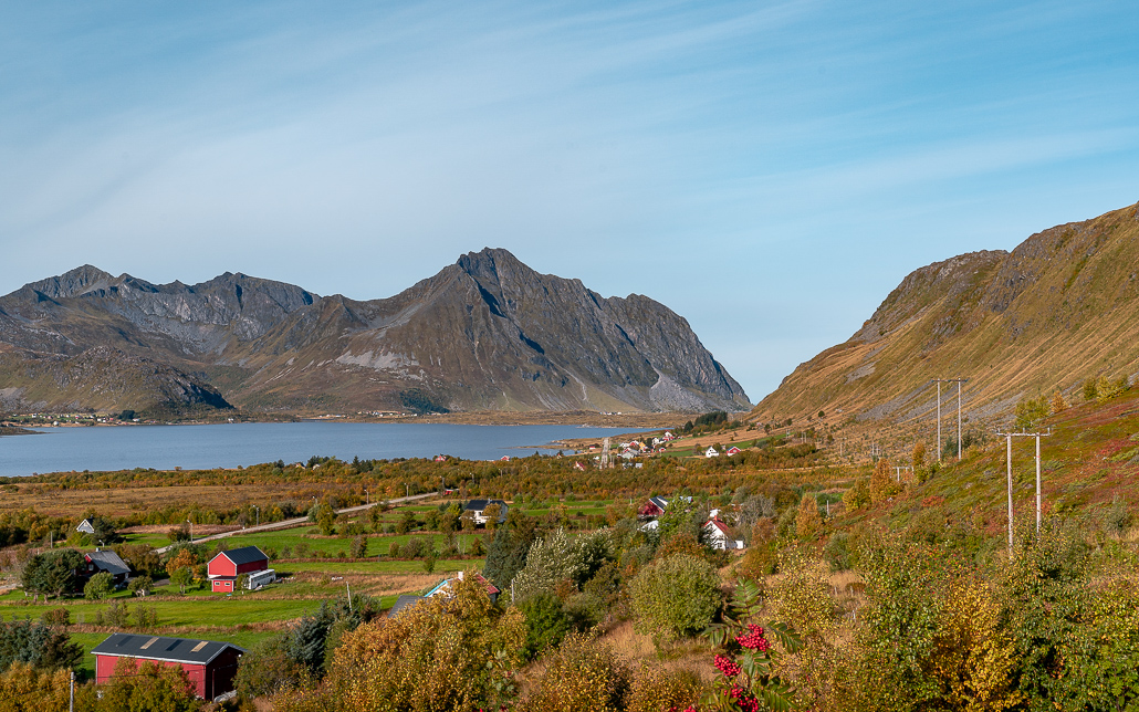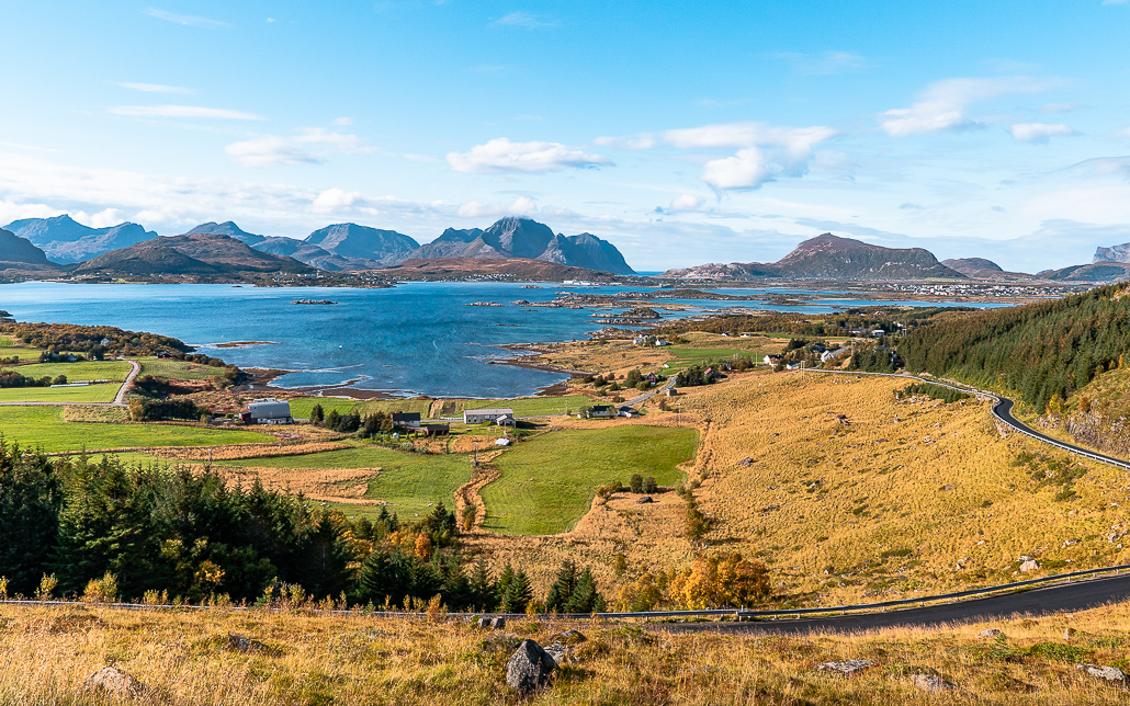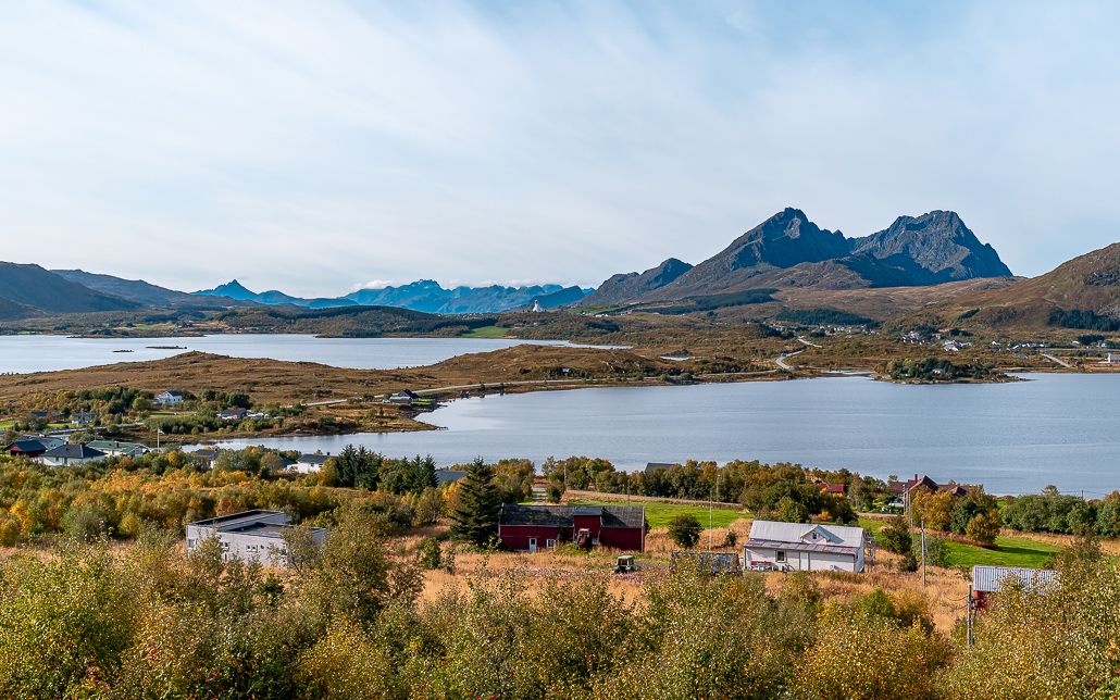 Heute verlasse ich Gimsøy über die Brücke Sundklakkbrua, um die nächste Insel Vestvågoy zu erkunden. Angeblich liegen hier die schönsten Strände der Lofoten. Ich werde es herausfinden. Heute folge ich der Europastraße E10, um einen kurzen Stop am Torvdalshalsen Rastplatz für die Aussichten einzulegen. Dieser ist immerhin in der Landschaftsroute Lofoten als besonderer Ort für Aussichten und ein Picknick markiert.