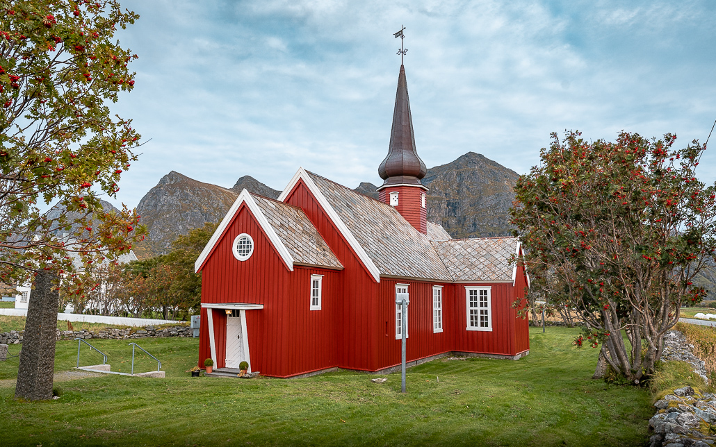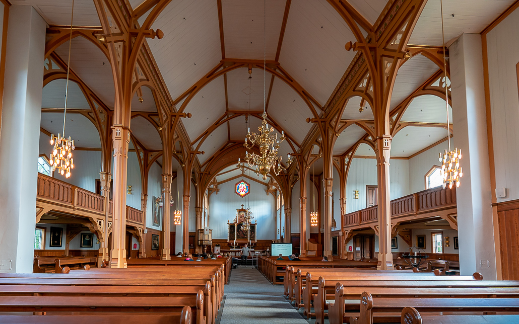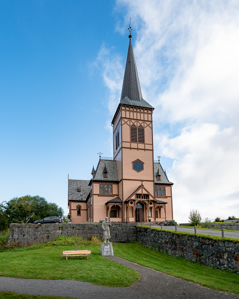 Nach der kurzen Wanderung und wieder einsetzendem Regen setze ich meine Fahrt über Kabelvåg Richtung Henningsvær fort. In Kabelvåg besuche ich auf Empfehlung die Vågan Kirche, aufgrund ihrer Größe auch Lofotenkathedrale genannt. Die Lofotenkathedrale gilt als größte Holzkirche Nordnorwegens. Sie befindet sich direkt an der Europastraße 10 in Kabelvåg, sodass du keinen Umweg in Kauf nehmen musst. Im Inneren finden 1200 Gläubige Platz. Da bei meinem Besuch eine Veranstaltung stattfand, habe ich die Kirche zügig wieder verlassen.