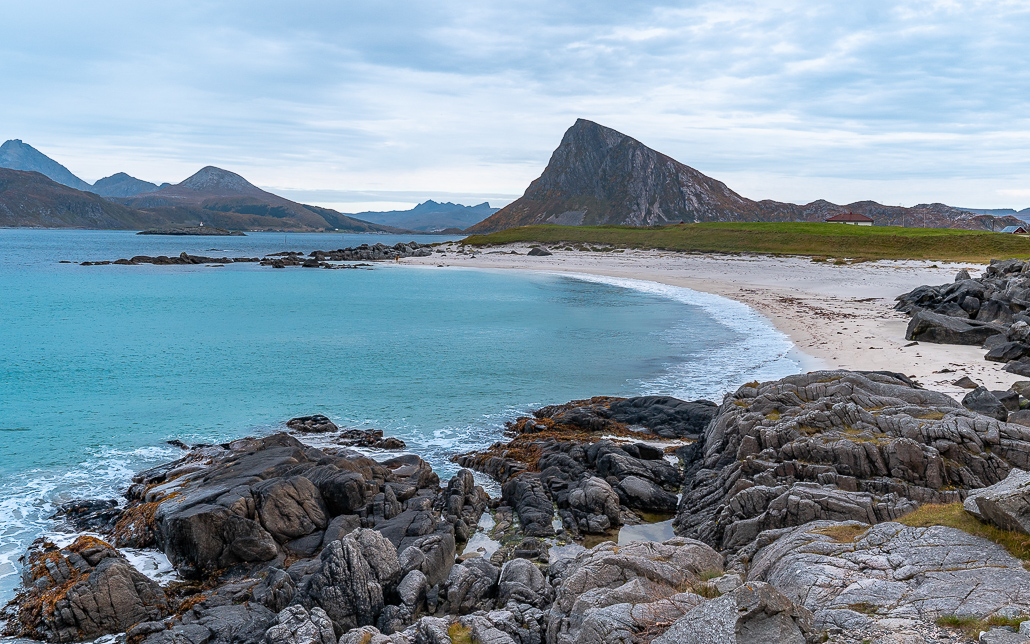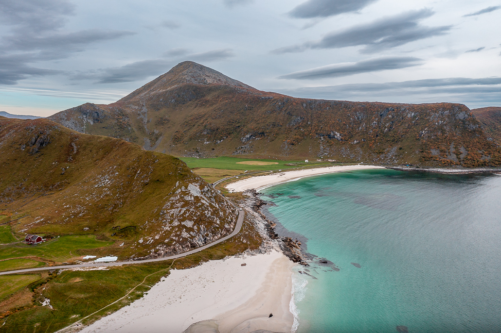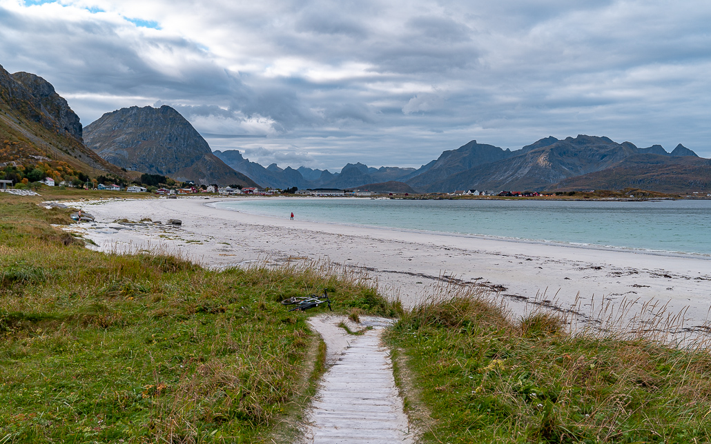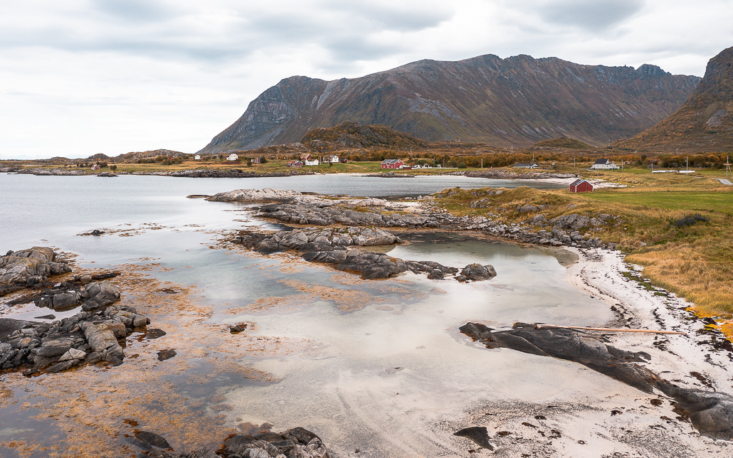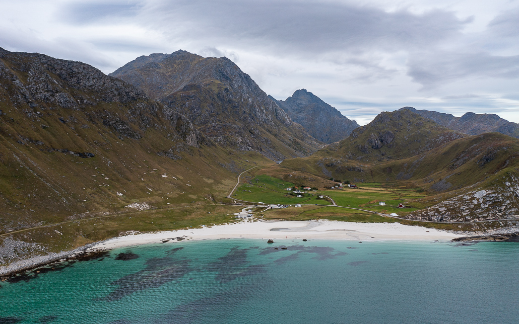 An der Abzweigung Richtung Henningsvaer entdecke ich einen kleinen aber feinen karibischen Strand namens Rørvikstrand. Ich parke und genieße die Sonnenstrahlen und die Aussichten. Ich bin mir fast sicher, dass du zur Nebensaison in der Haltebucht oder dem Parkplatz mit deinem Camper über Nacht stehen kannst. Trotzdem bin ich weitergefahren, da ich nicht nachvollziehen kann, warum so viele Camper direkt an der Straße, wo der ganze Verkehr die ganze Nacht durchfährt, stehen bleiben, nur um ein paar Euro zu sparen.