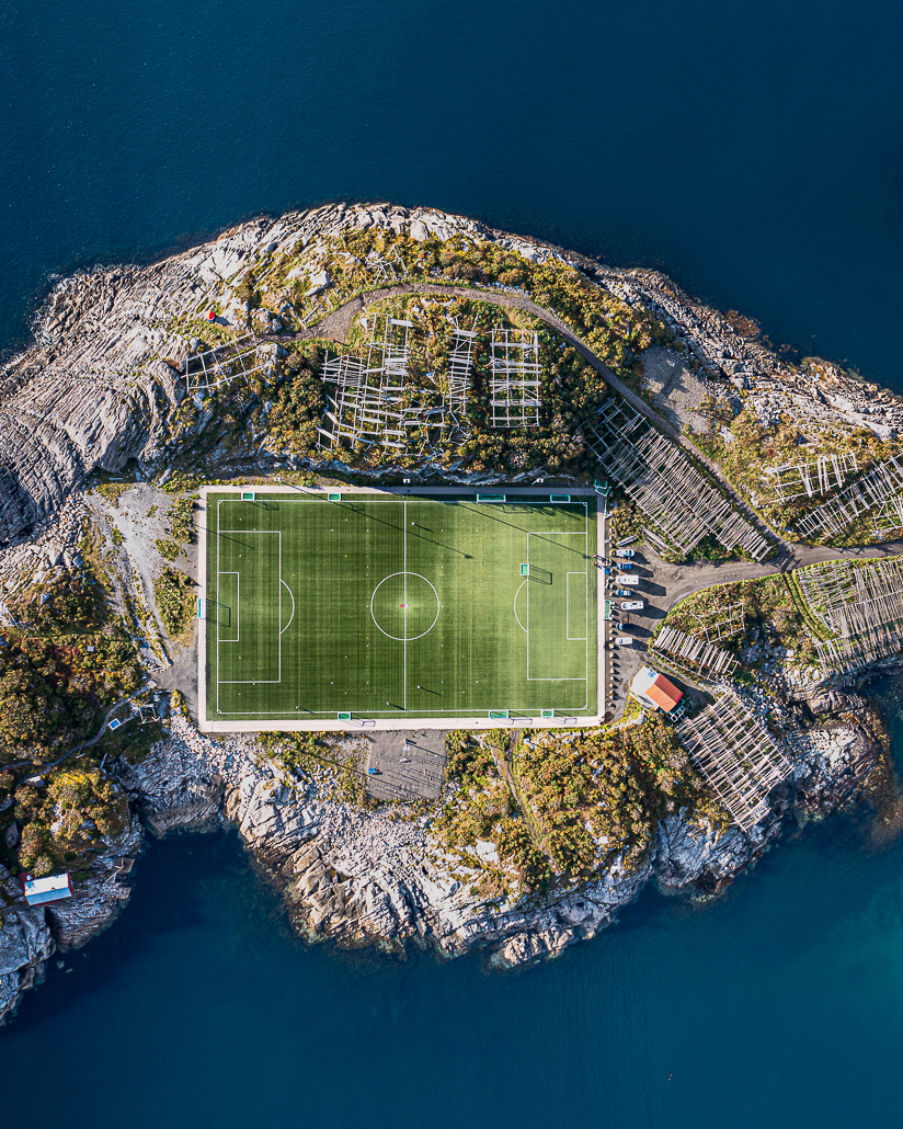 Hier haben sich viele Kreative und Künstler niedergelassen. Es gibt urgemütliche Cafés und Restaurants mit einer hervorragenden Qualität und sogar Street-Art. Hier gibt es auch den meistfotografierten Fußballplatz der Welt, den sich kein Besucher entgehen lassen sollte. Von oben natürlich noch eindrucksvoller anzusehen. Die höchste Aussicht (ohne Drohne) bekommst du, indem du auf den Berg Heia kletterst. Trotzdem kein Vergleich zu Aufnahmen mit Drohne.