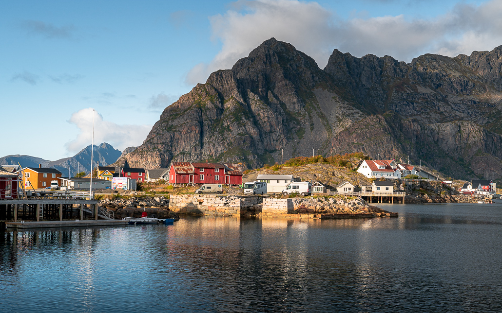 Der Ort Reine ist vermutlich der bekannteste auf den Lofoten. Mir scheint es so, als ob hier mehr Verbotsschilder prangen, als an anderen Orten. Es sind kaum Parkplätze vorhanden und der Aufstieg auf den Reinebringen ist aufgrund Wartungsarbeiten für 2 Monate gesperrt. Trotzdem ergattere ich einen Platz auf dem Parkplatz Reinehalsen an der E10 gelegen.