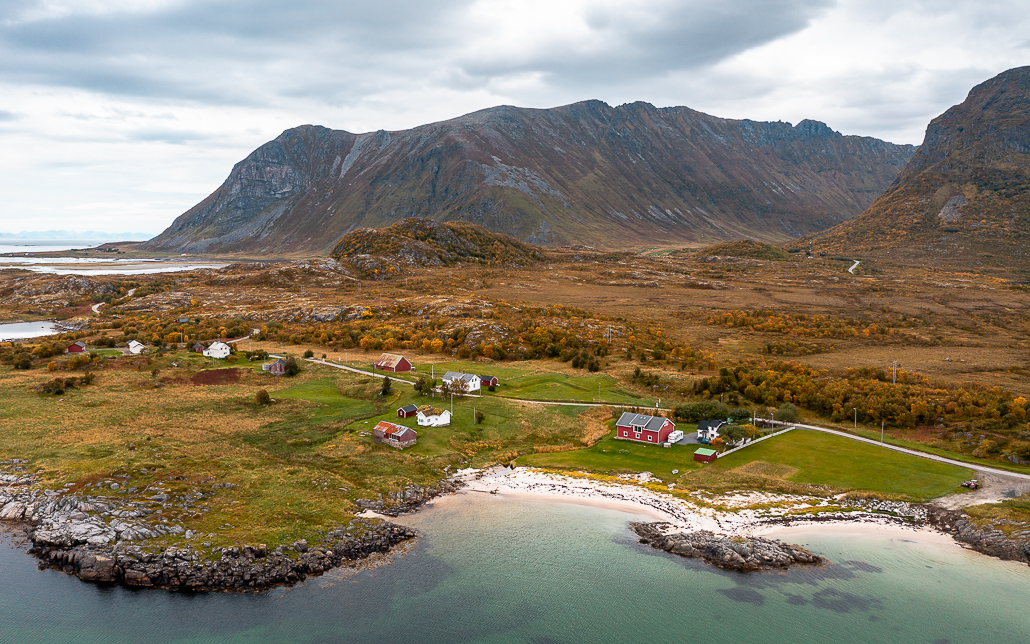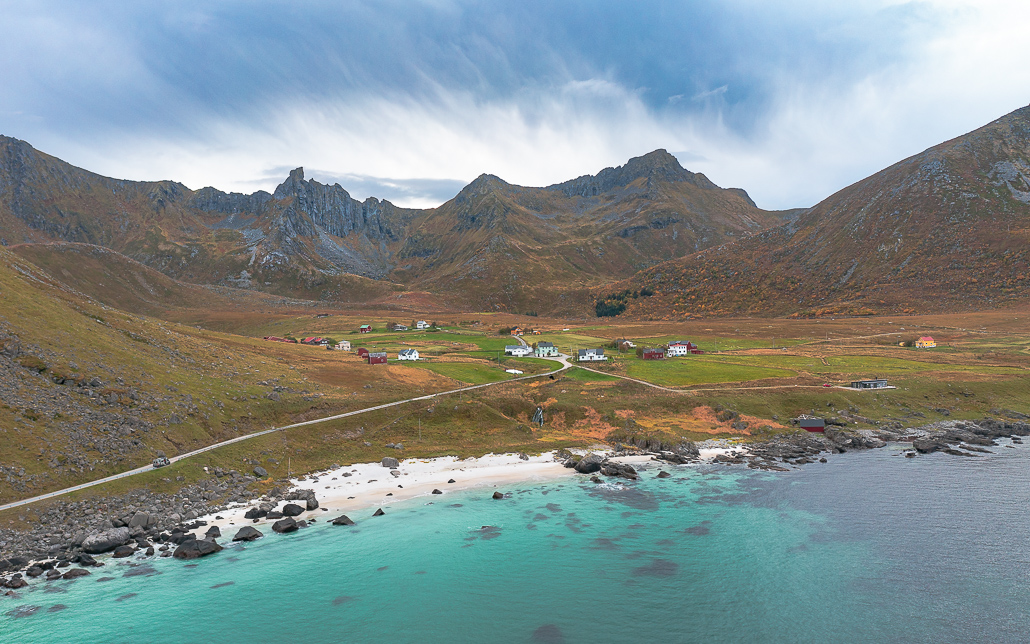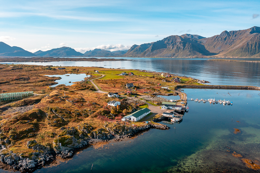 Der nördlichste Punkt der Insel Gimsøy ist ein kleines verschlafenes Fischerdorf, das aus wenigen Häusern besteht. Parkplätze gibt es nicht, also frage nett bei Locals, wo du anhalten kannst. Überall finden sich die Holzgestelle, auf denen im Herbst der Stockfisch getrocknet wird.