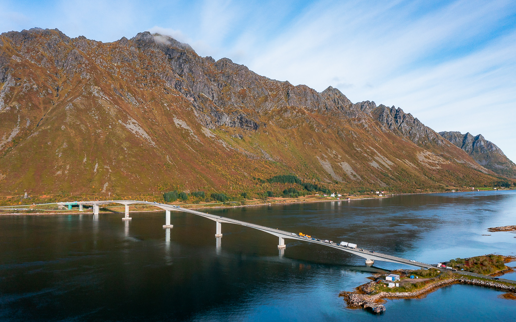 Am Morgen verlasse ich Henninsvaer nach einem Frühstück im Henningsvær Lysstøperi & Cafe inklusive Zimtschnecke (zum Mitnehmen für später) und fahre über die Brücke Gimsøybrua, die die Inseln Austvågøy und Gimsøy verbindet. Das Wetter ist klasse und es herrscht kaum Wind. Hätten wir zu hohe Windgeschwindigkeiten, dann wäre die Brücke gesperrt. Auch aus diesem Grund musst du immer Puffertage für die Lofoten einplanen.