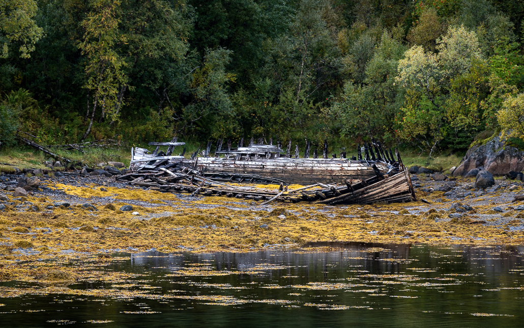 Am Rastplatz Austnesfjorden halte ich an, um das tolle Panorama auf die Halbinsel Sildpollsnet zu genießen. Wow, einfach magisch schön. Wenn du ein tolles Fotomotiv suchst, solltest du ab hier ein wenig zu Fuß entlang der Straße (aus der Richtung, aus der wir gekommen sind) gehen, um das alte verfallene Wrack eines Fischerbootes zu fotografieren. Um direkt hinab zu gelangen, musst du ein wenig klettern.