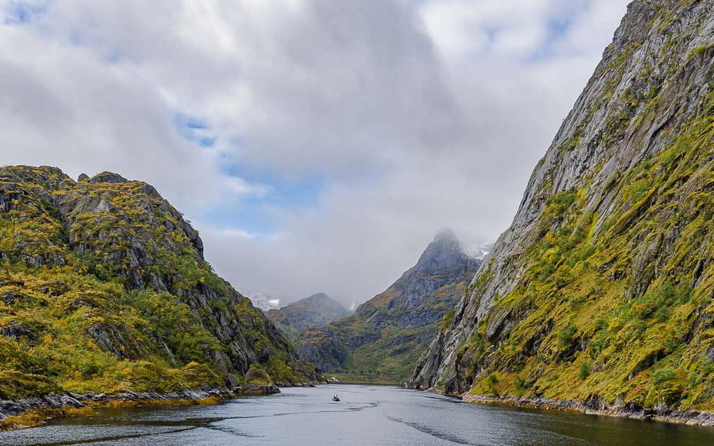 Der Trollfjord ist sehr imposant: Der rund 3 km lange Seitenarm des Raftsundet ist bei seiner Mündung nur 100 Meter breit. Eingerahmt von Bergen, die bis zu 1.100 Meter hoch sind, leuchtet das Fjord an diesem Tag in den schönsten Grüntönen. Die maximale Tiefe des Fjords beträgt 72 Meter und Szenen des Filmes Downsizing mit Matt Damon wurden hier gedreht. Im Fjord gibt es zwei Kraftwerke, die vom Trollfjordvatnet und Botnvatnet gespeist werden. Norwegen at it's best.