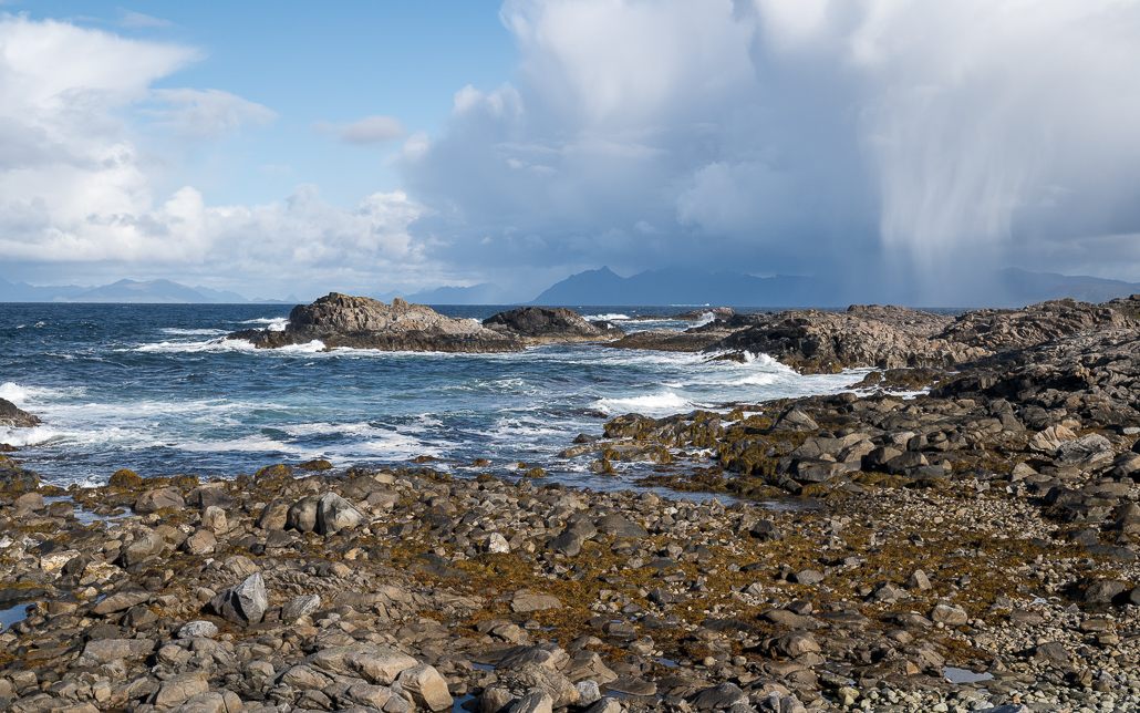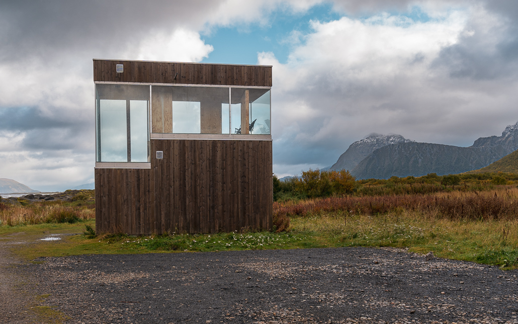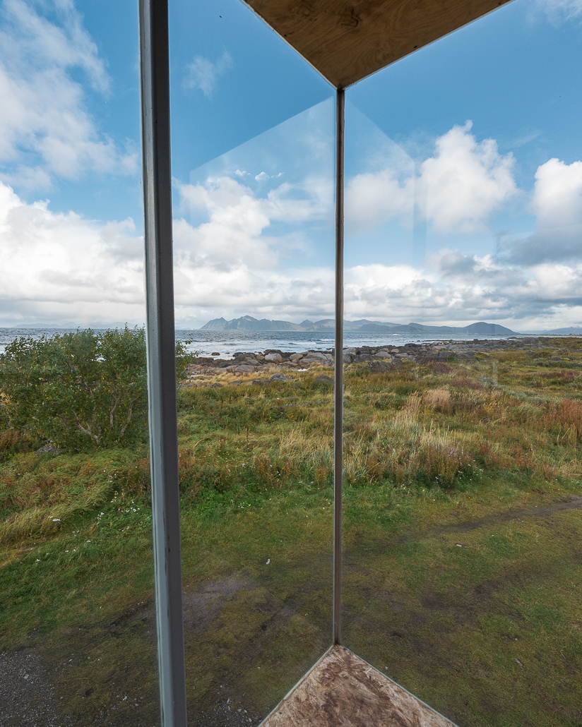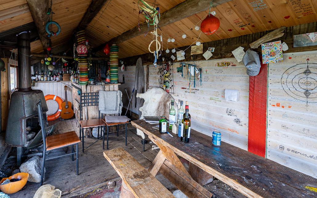 In der Hütte (die übrigens aus Treibgut erbaut ist und Hinterlassenschaften von anderen Reisenden) verbringe ich den verregneten Abend mit einem Freund, der heute auch hier angekommen ist. Im Inneren brennt ein Kaminfeuer, andere Reisende kochen. Und gemeinsam tauschen wir Erlebnisse unserer Reisen aus und verbringen einen tollen Abend. Am nächsten Morgen ist das Wetter ein wenig besser, sodass ich die schöne Aussicht auf das Meer und die Vesterålen genießen kann.