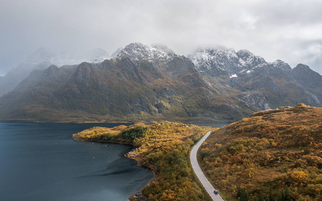 Ich bin mit meinem eigenen Wohnmobil (Kastenwagen) auf die Lofoten gefahren. Da sich hinter jeder Kurve das nächste Postkartenmotiv bietet, ist es ideal, unabhängig und flexibel zu reisen. Die Straßen sind super ausgebaut, die E10 (eine der 18 norwegischen Nationalen Touristenrouten) bringt dich über die ganze Inseln. Du benötigst keine Fähre, um von Insel zu Insel zu gelangen.