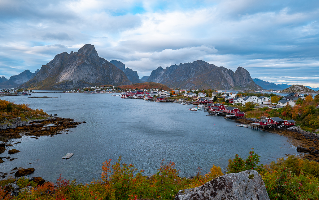 Auch ohne die steile Wanderung auf den Reinebringen hast du von hier einen tollen Ausblick auf Reine, das Reinefjord und die Landschaft. An windstillen Tagen spiegeln sich die Häuser im Wasser – bei mir herrscht: Sturm. Das Wasser peitscht durch das Fjord. Trotzdem hast du am Parkplatz ein tolles Panorama.