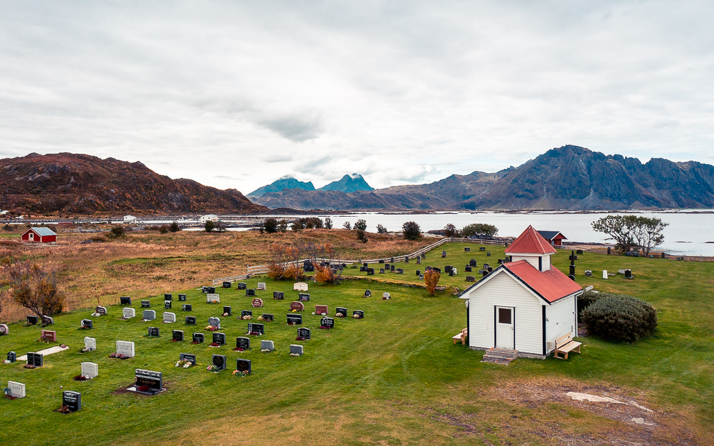 Auch hier verlasse ich die E10, um auf der Nebenstraße um an einen kleinen Strand samt Gimsøy Kirke zu besuchen. Die kleine Kirche liegt wunderschön und ist eines der Highlights der Lofoten. Der Friedhof ist klein, aber für Fans dieser Orte auch wirklich sehenswert. Ich komme mit anderen Reisenden ins Gespräch, die hier auf dem Parkplatz ihre Nacht verbracht haben (man beachte zur Nebensaison, denn sonst ist es verboten. Die Anwohner finden es nicht so gut, wenn der Parkplatz im Sommer voll mit Wohnmobilen ist).