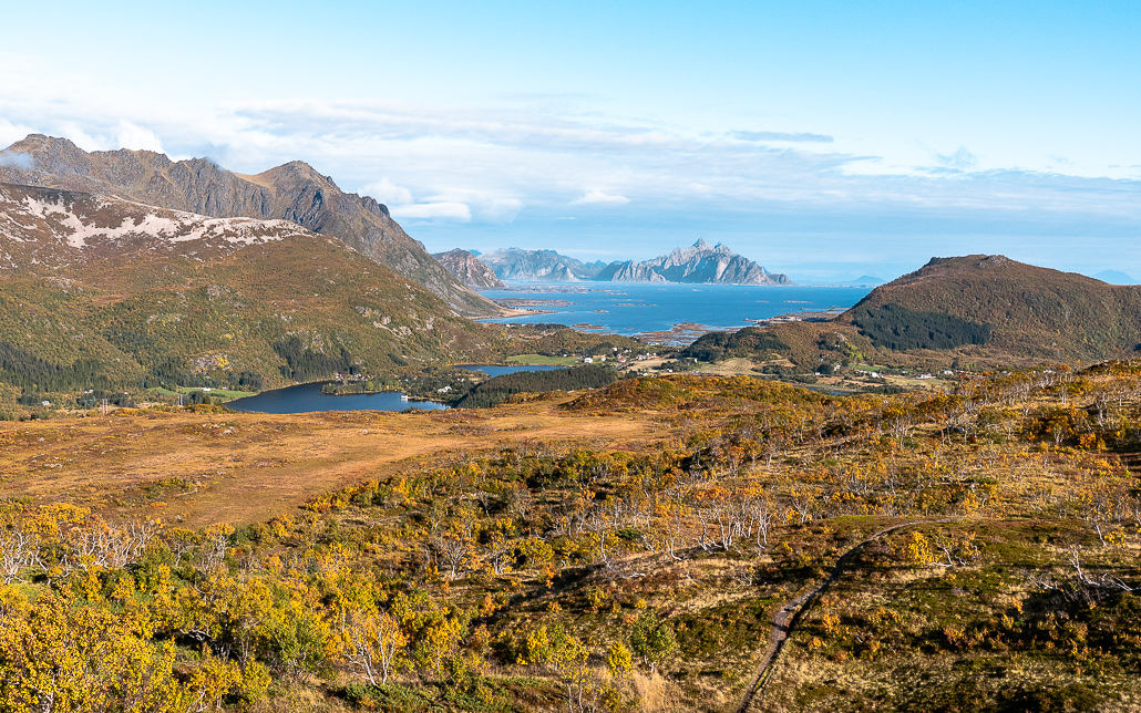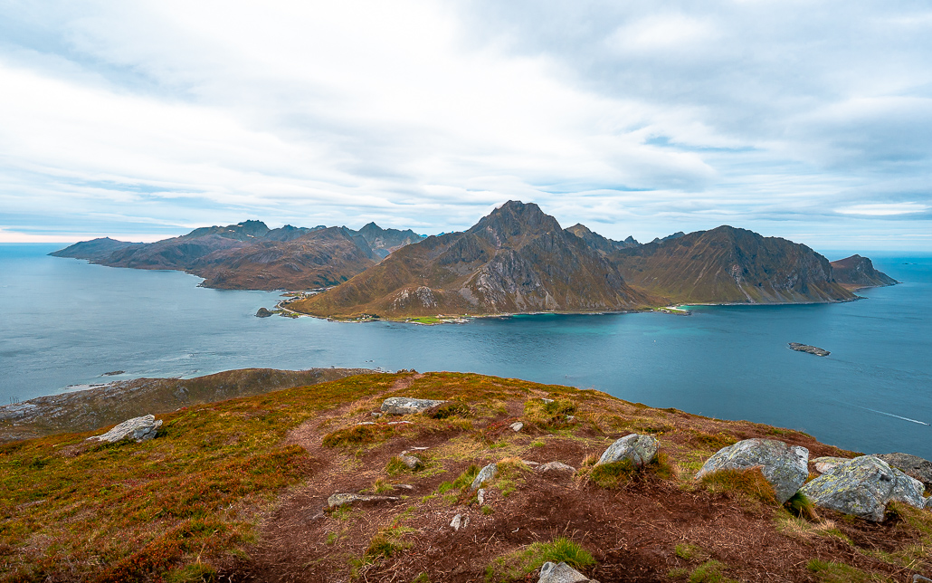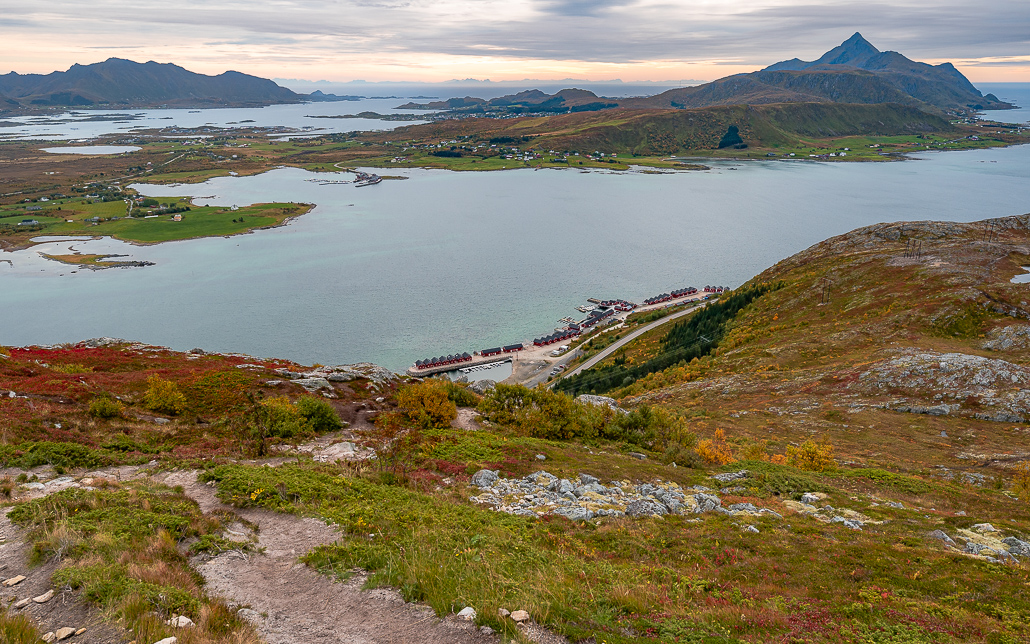 Rund um Svolvær gibt es mehrere Wanderungen, die immer wieder empfohlen werden. Hierfür empfehle ich den Rother Wanderführer Lofoten und die Komoot App, um geeignete Wanderungen zu finden und nach zuwandern. Aufgrund starken Regenfällen waren bei mir eine Wanderung gesperrt (Fløya Wanderung) und daher blieb nur die Wanderung zum Tuva. Auch bei dieser – wie bei jeder anderen Wanderung auf den Lofoten - hast du fantastische Ausblicke. Auch hier erkenne ich ein Muster: Es geht kurz und knackig nach oben.