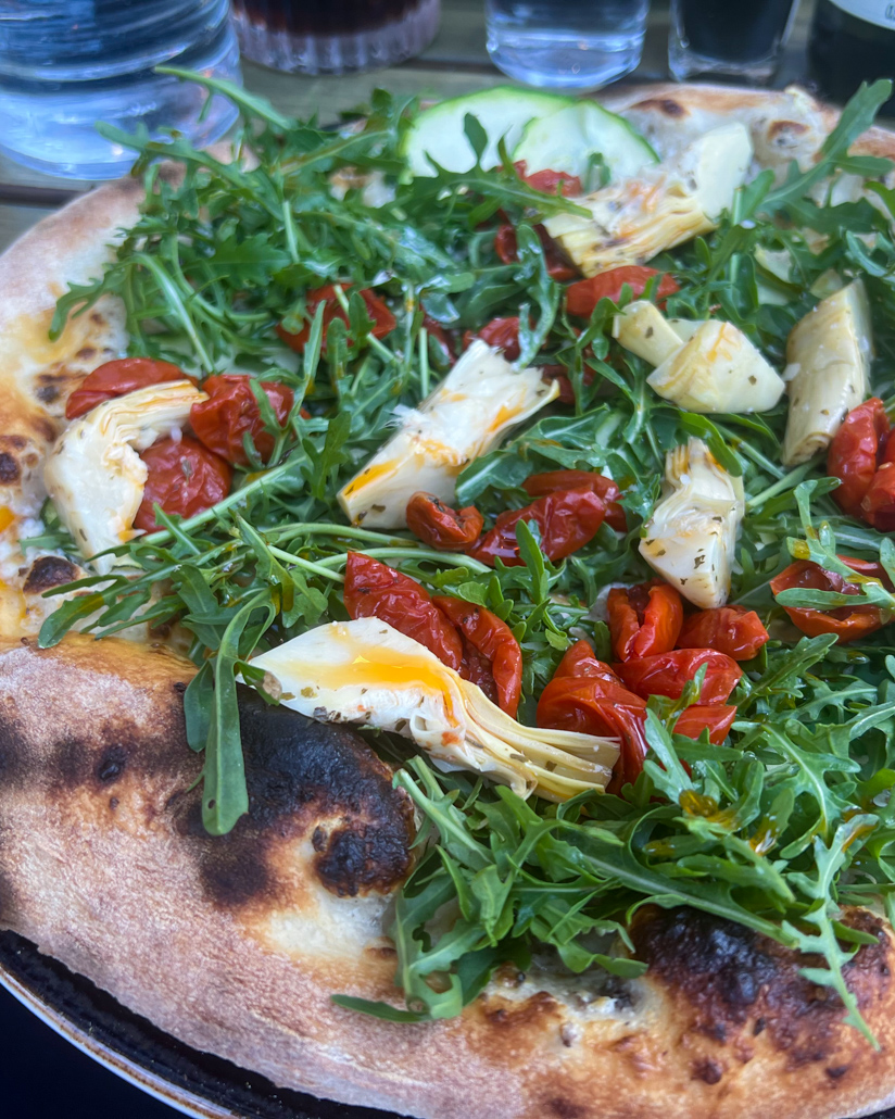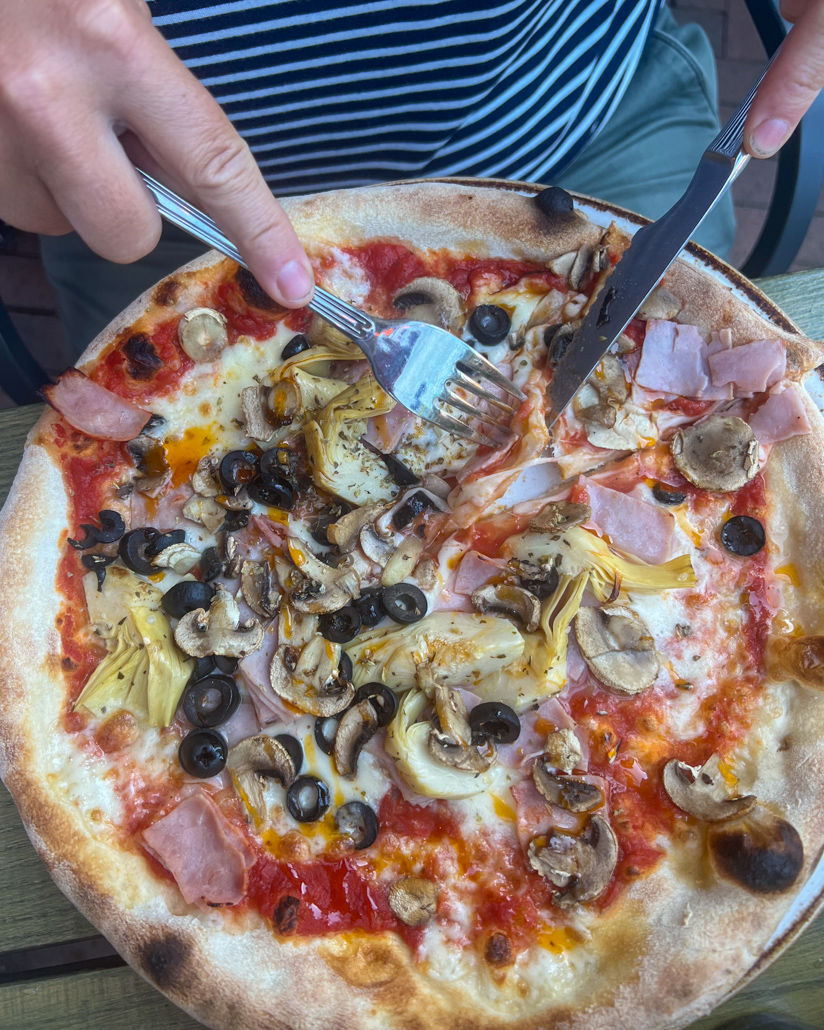 Das bekannte Konzept der Eataly Restaurants gibt es auch in Oslos modernem Viertel Aker Brygge. Das Restaurant ist rustikal auf hip gemacht und gefällt uns hervorragend. Wir bekommen im Außenbereich einen Platz und bestellen zwei Pizzen: Einmal Pizza Vegetarisch und einmal Pizza Capricciosa.