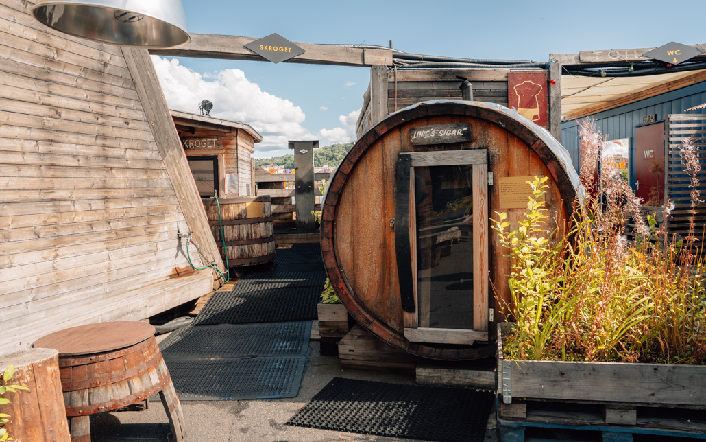 Die gesamte Location besteht aus mehreren Langhäusern, wie sie in Nordnorwegen zum Fisch trocknen genutzt werden. Außerdem gibt es sechs Fass-Saunen (für 6 bis 80 Personen). Wir haben uns trotzdem für die Sauna direkt gegenüber dem Opernhaus entschieden. Mehr zu dieser Sauna findest du bei unseren Geheimtipps für Oslo.