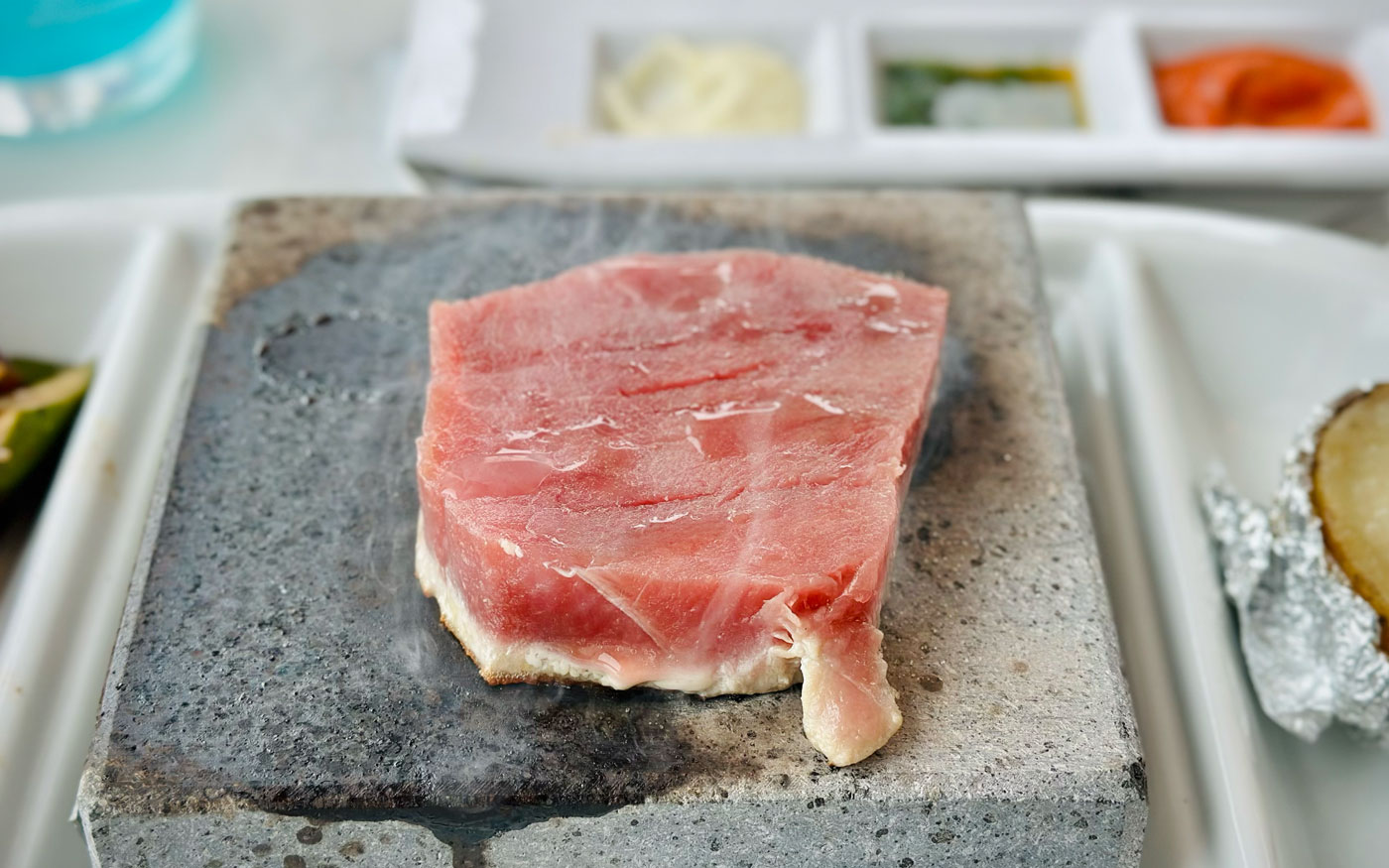 Zurück an Bord reservierte ich mir einen Platz im „Hot Rock“-Restaurant. Hier konnte man auf 450 Grad Celsius heißen Steinen das eigene Fleisch nach Wahl zu seinem Gunsten braten. Ich hatte Ahi Tuna, das NY Strip Serloin sah aber ebenfalls fantastisch aus.