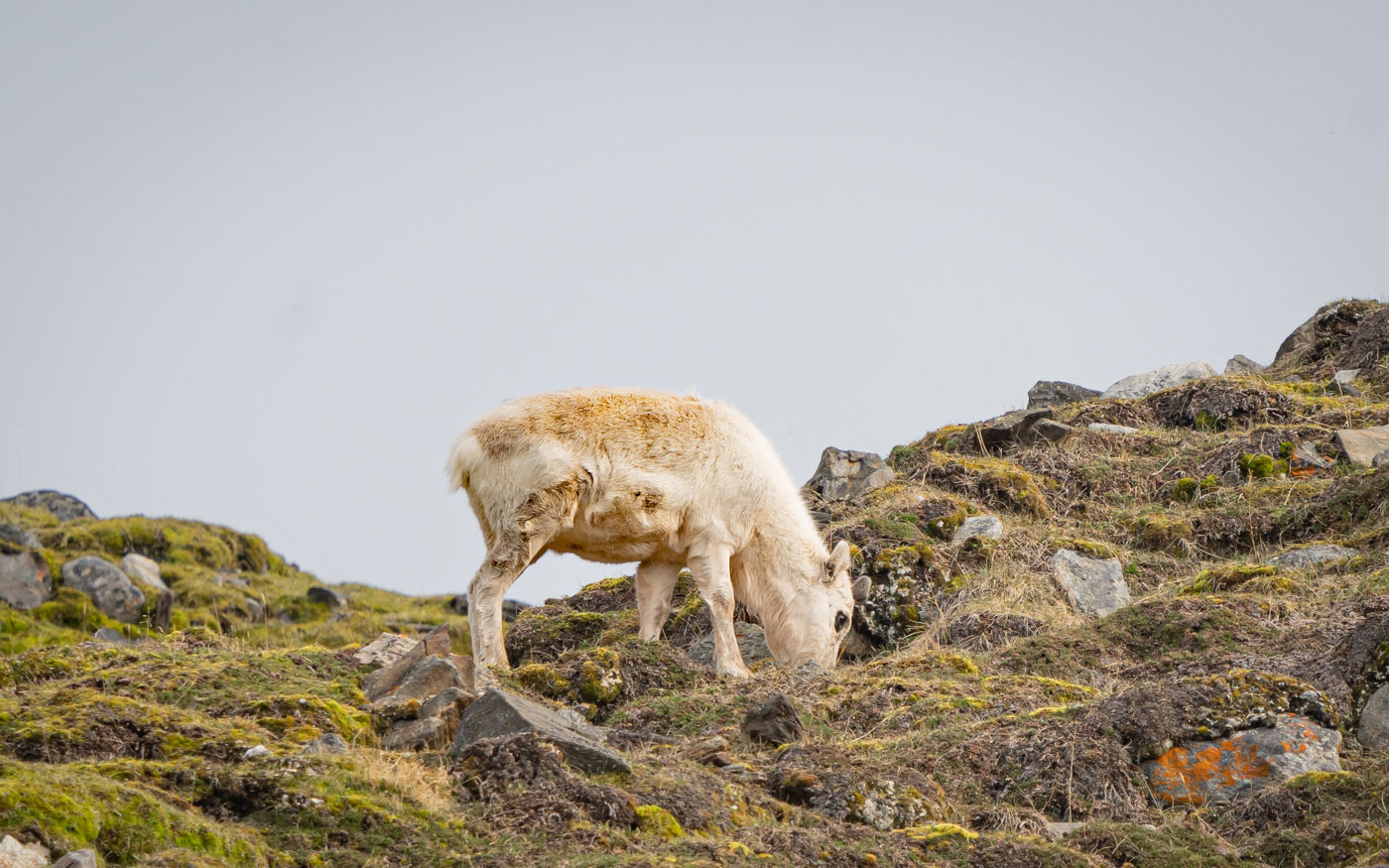 Zuvor gab es aber noch eine Handvoll Rentiere zu sehen. Generell war es hier enorm schön, es gab außerdem einen kleinen Berg, von dem man einen wunderbaren Blick über die wieder einmal sonnen geflutete Gegend hatte. Von dort erspähte ich dann auch endlich einen der scheuen Füchse auf der gegenüberliegenden Felswand. Zwar weit weg, aber irgendwie habe ich ihn dann doch auf die Linse des Zoomrobjektivs (200-600 mm) bekommen.