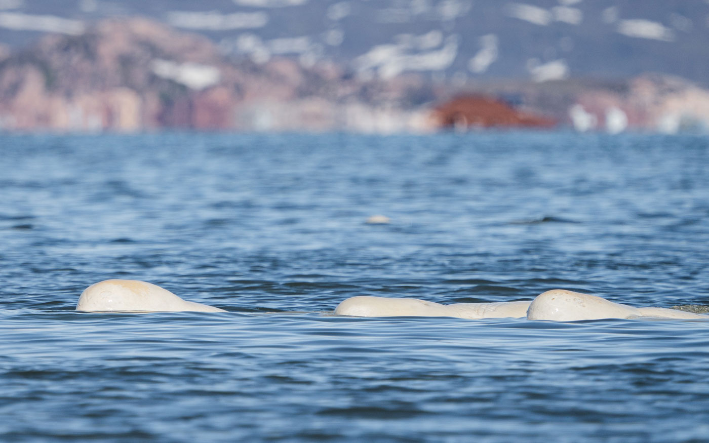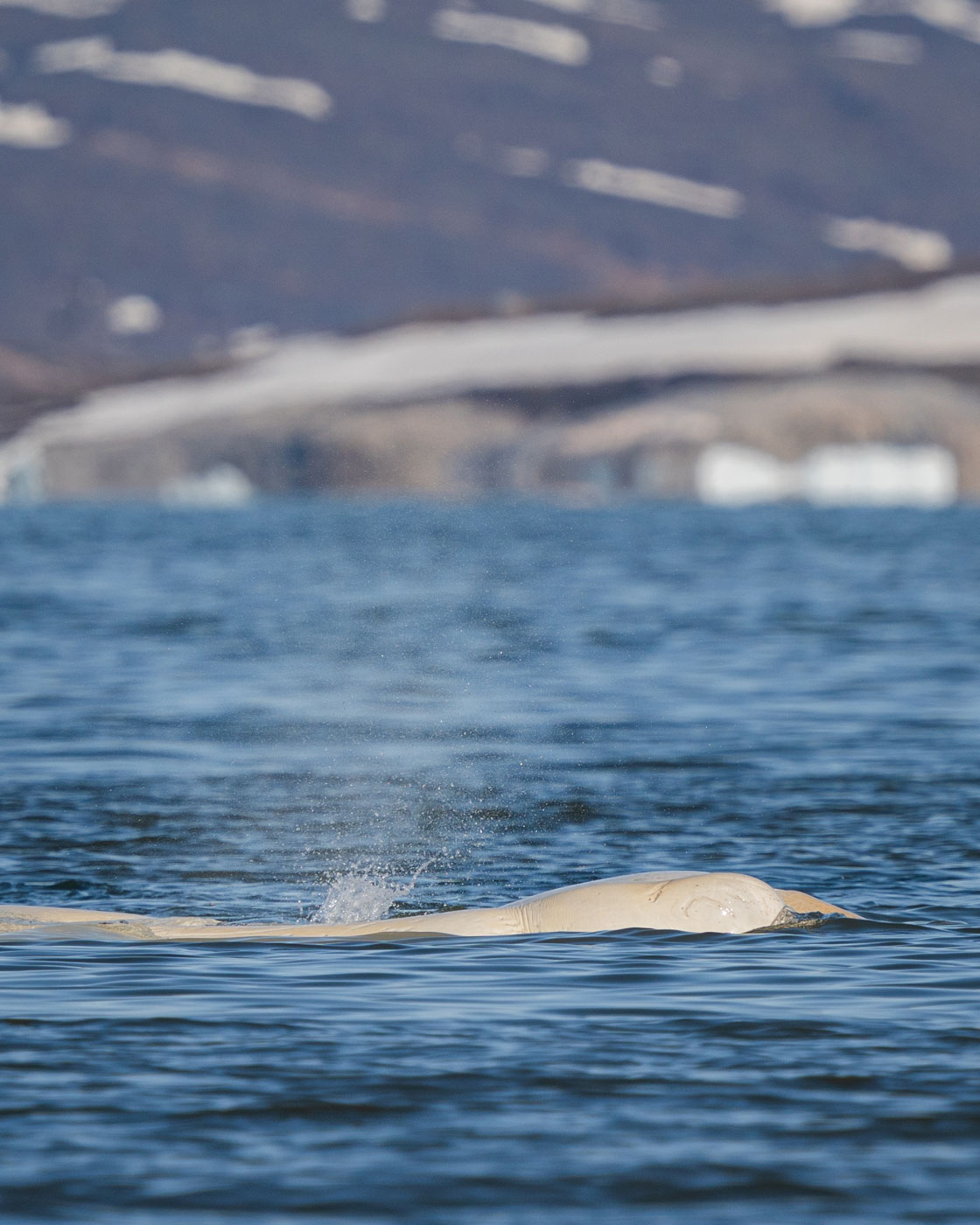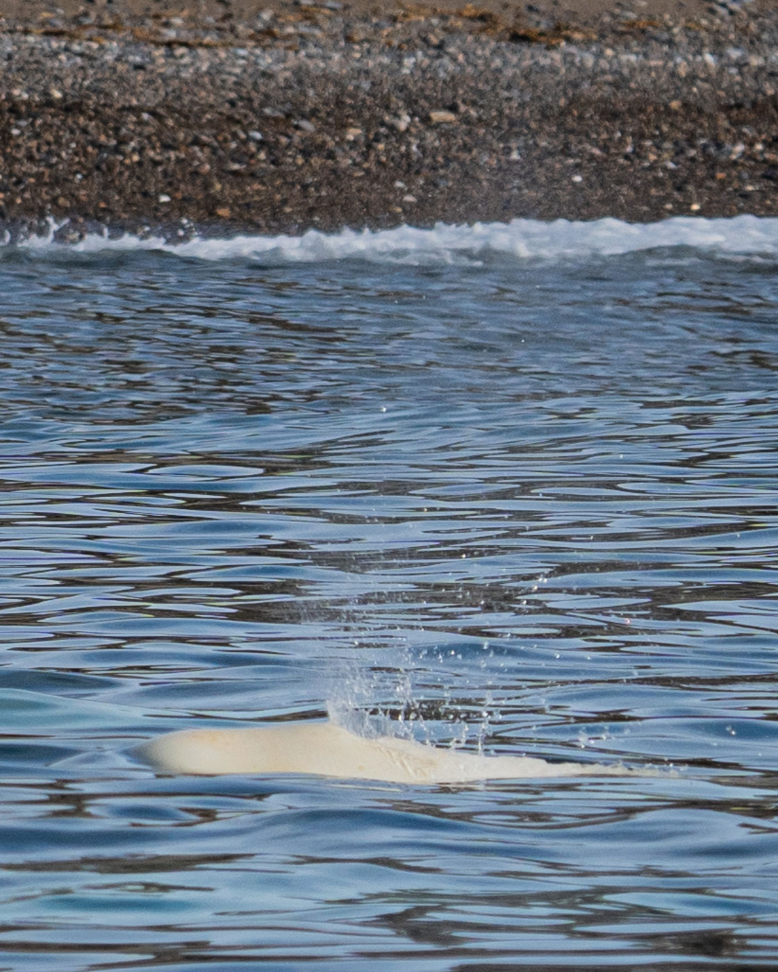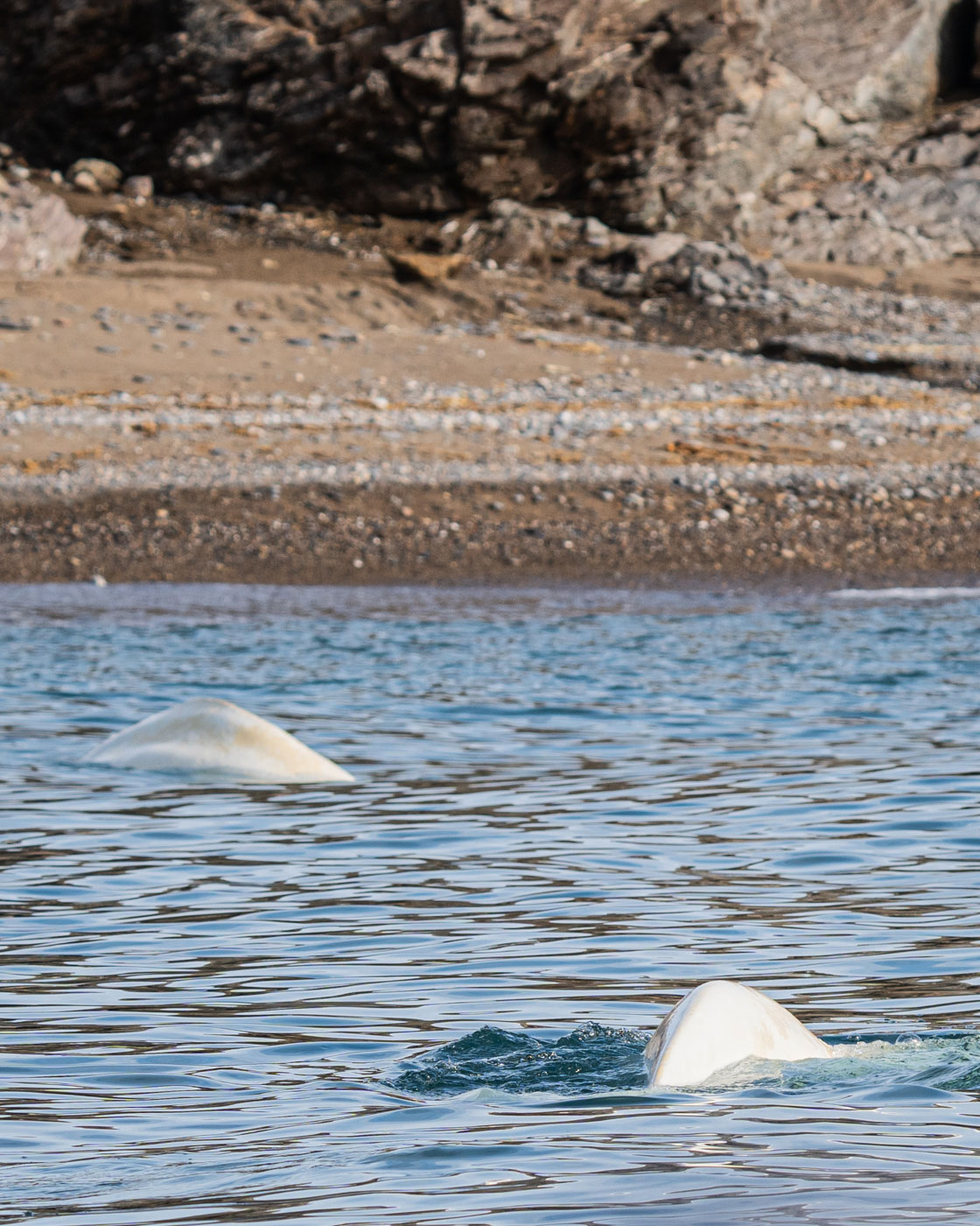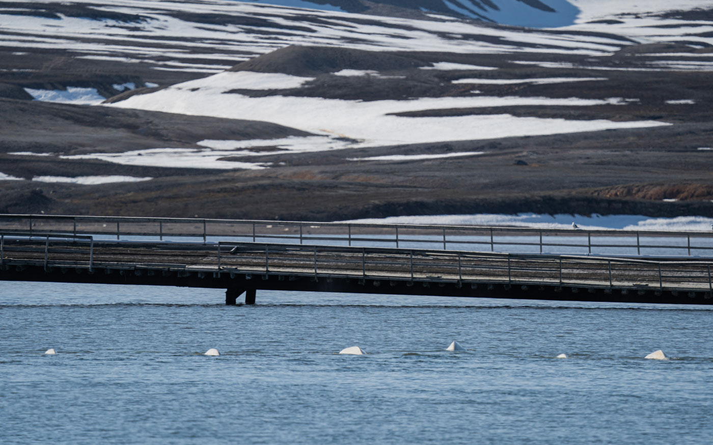 Auf dem Weg zurück sahen wir erneut (!) Belugawale, diesmal direkt am Pier vor dem Bug der Ocean Albatros. Die Guides vermuteten, dass es sich dabei um die gleiche Gruppe handelte, die wir am Vortag gesehen hatten. Sie schienen Gefallen an uns gefunden zu haben.
