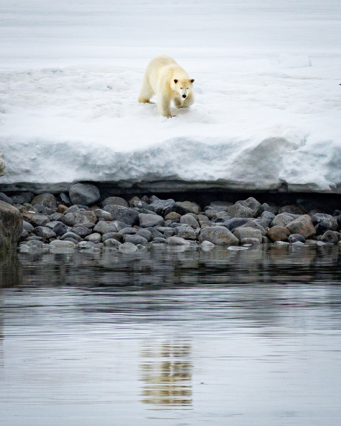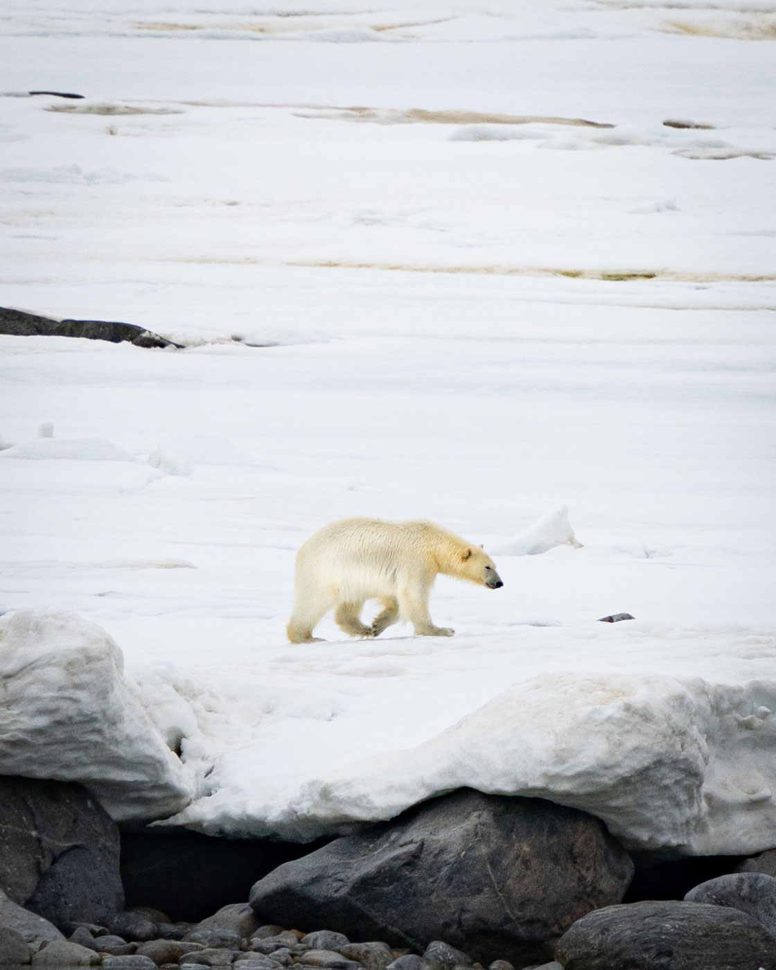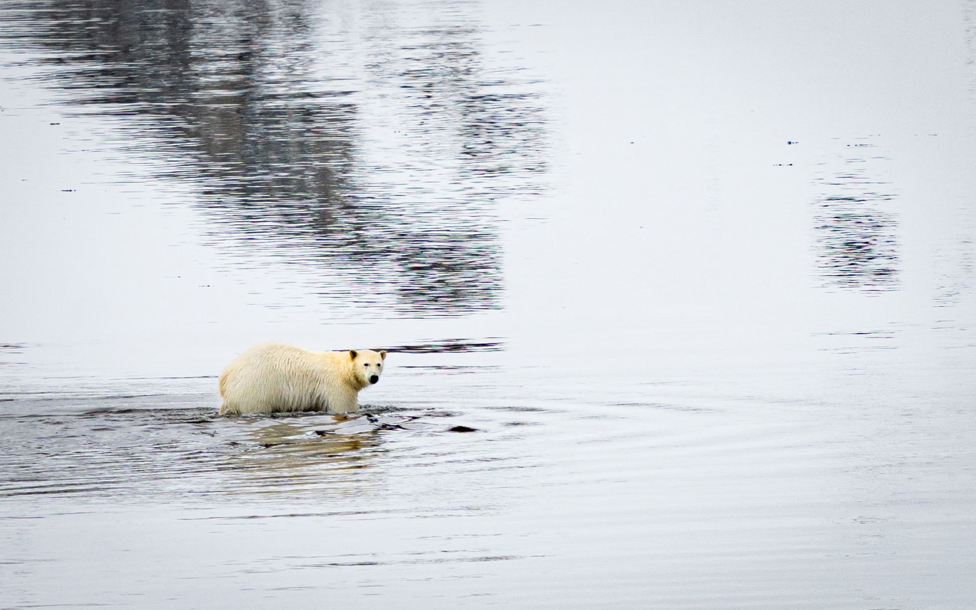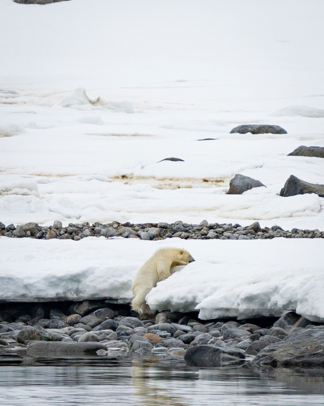 Es war erneut früh am Morgen, als wir die Durchsage erhielten, dass ein weiterer Eisbär an Land gesichtet wurde. Ich war gerade auf dem Weg ins Fitnessstudio, und in kurzen Jogginghosen fotografierte ich, was das Zeug hielt.