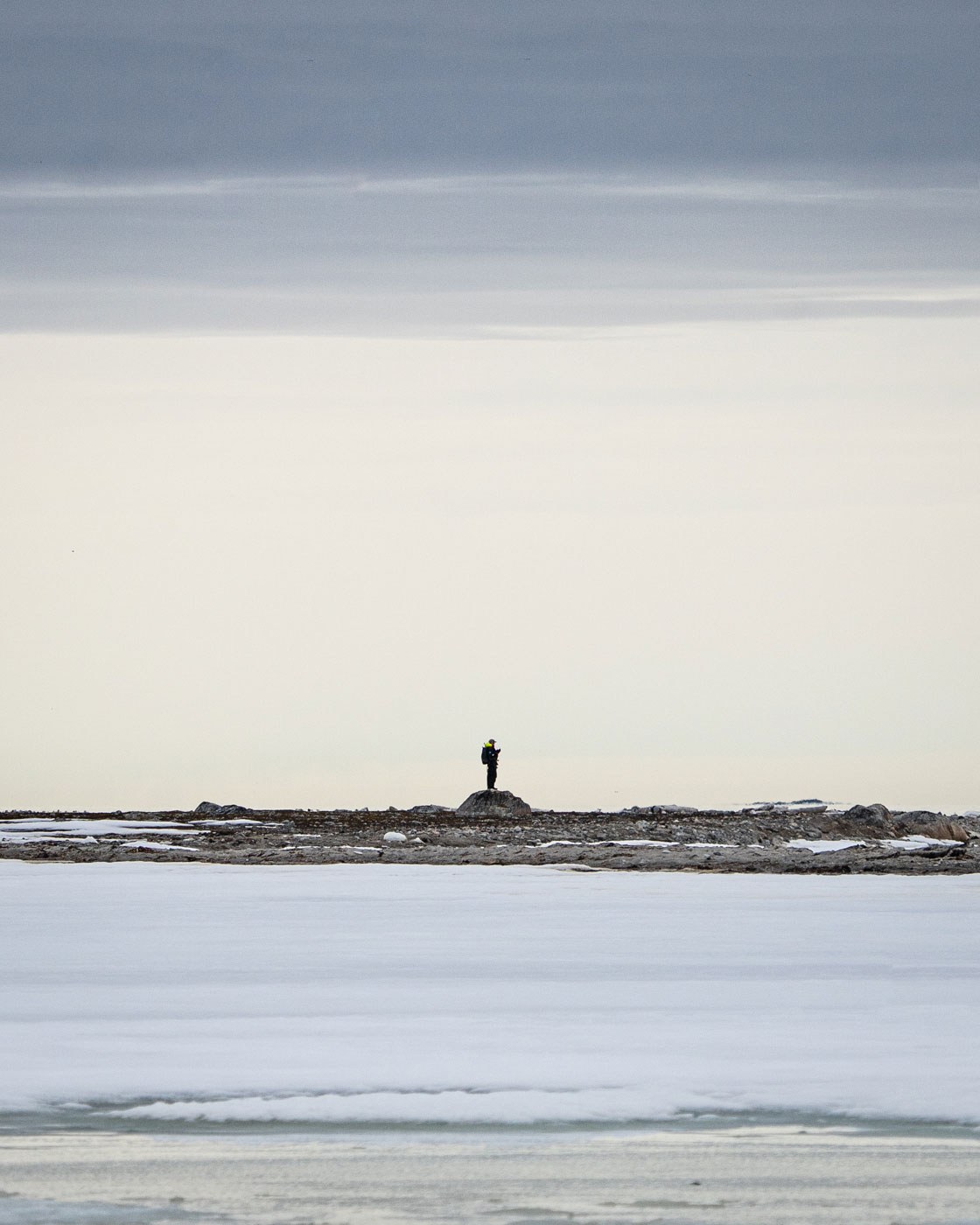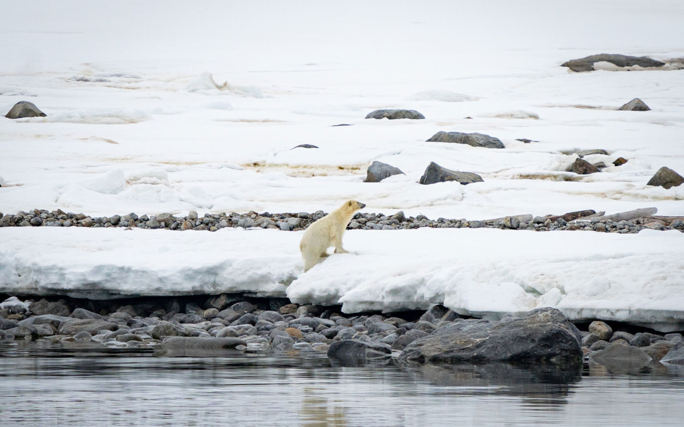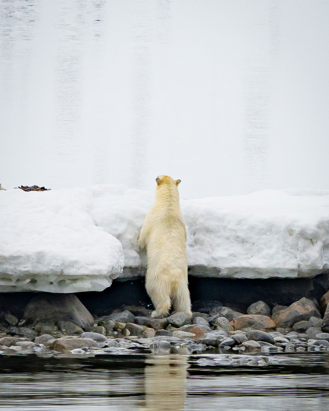 Es war erneut früh am Morgen, als wir die Durchsage erhielten, dass ein weiterer Eisbär an Land gesichtet wurde. Ich war gerade auf dem Weg ins Fitnessstudio, und in kurzen Jogginghosen fotografierte ich, was das Zeug hielt.