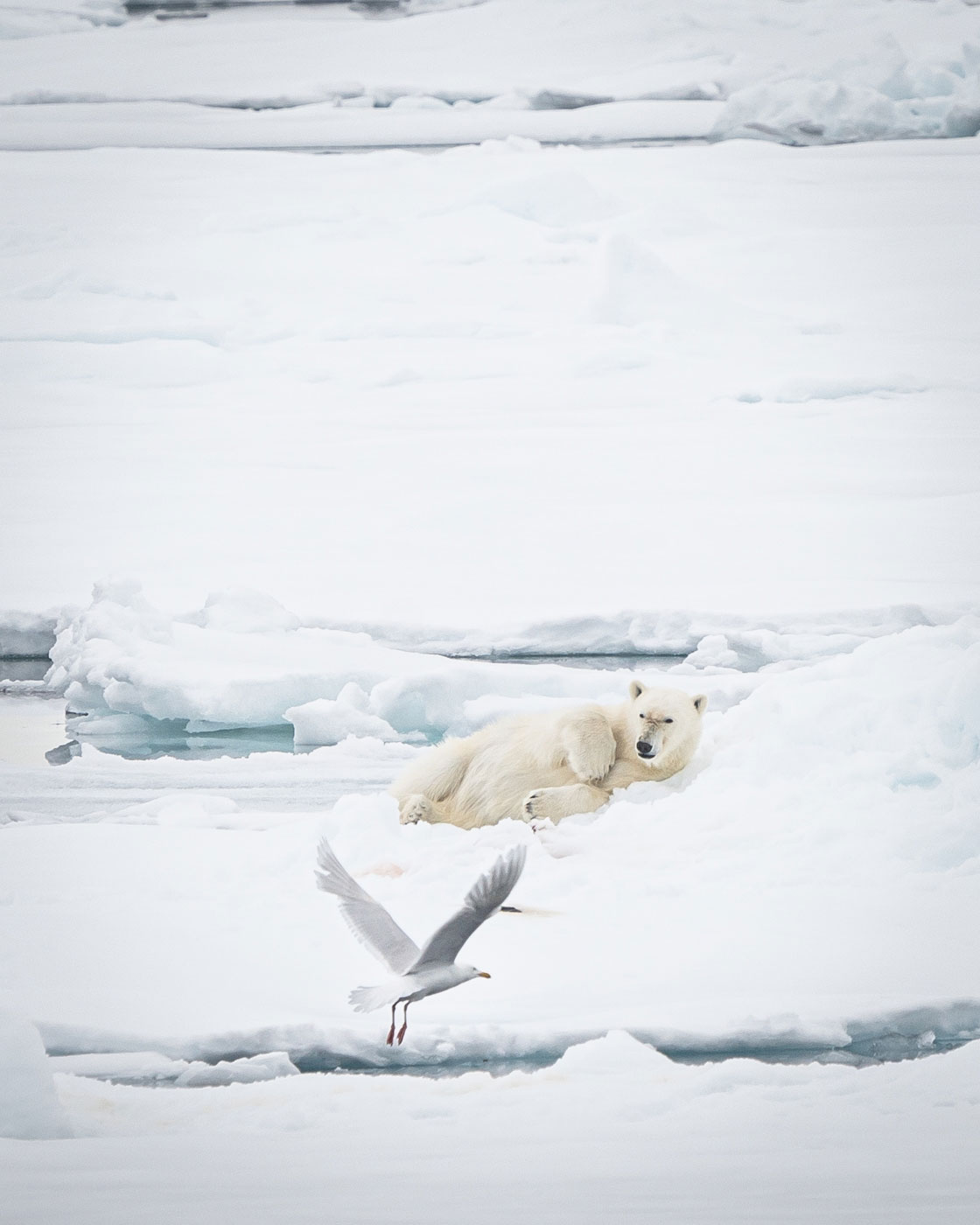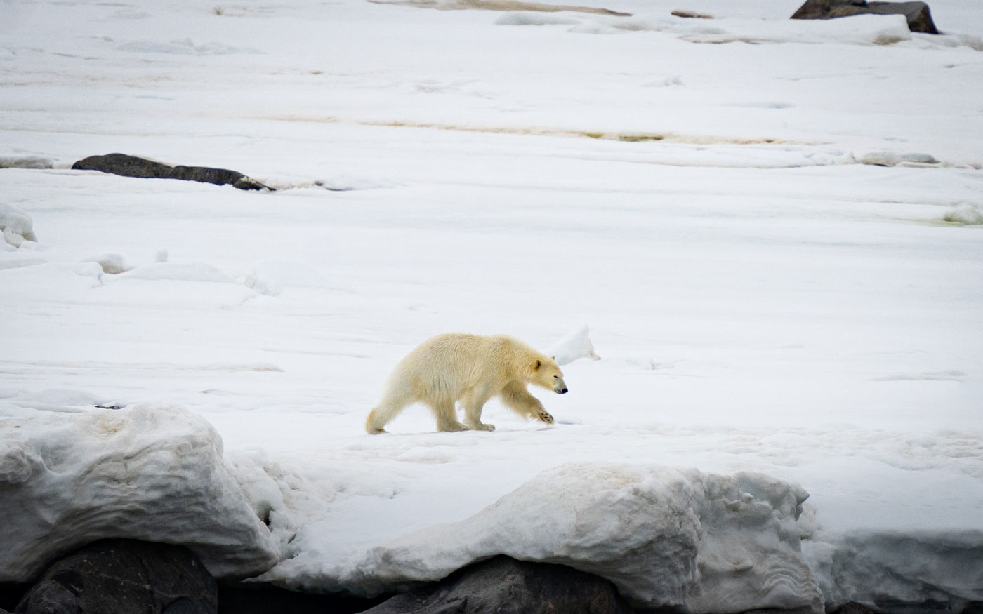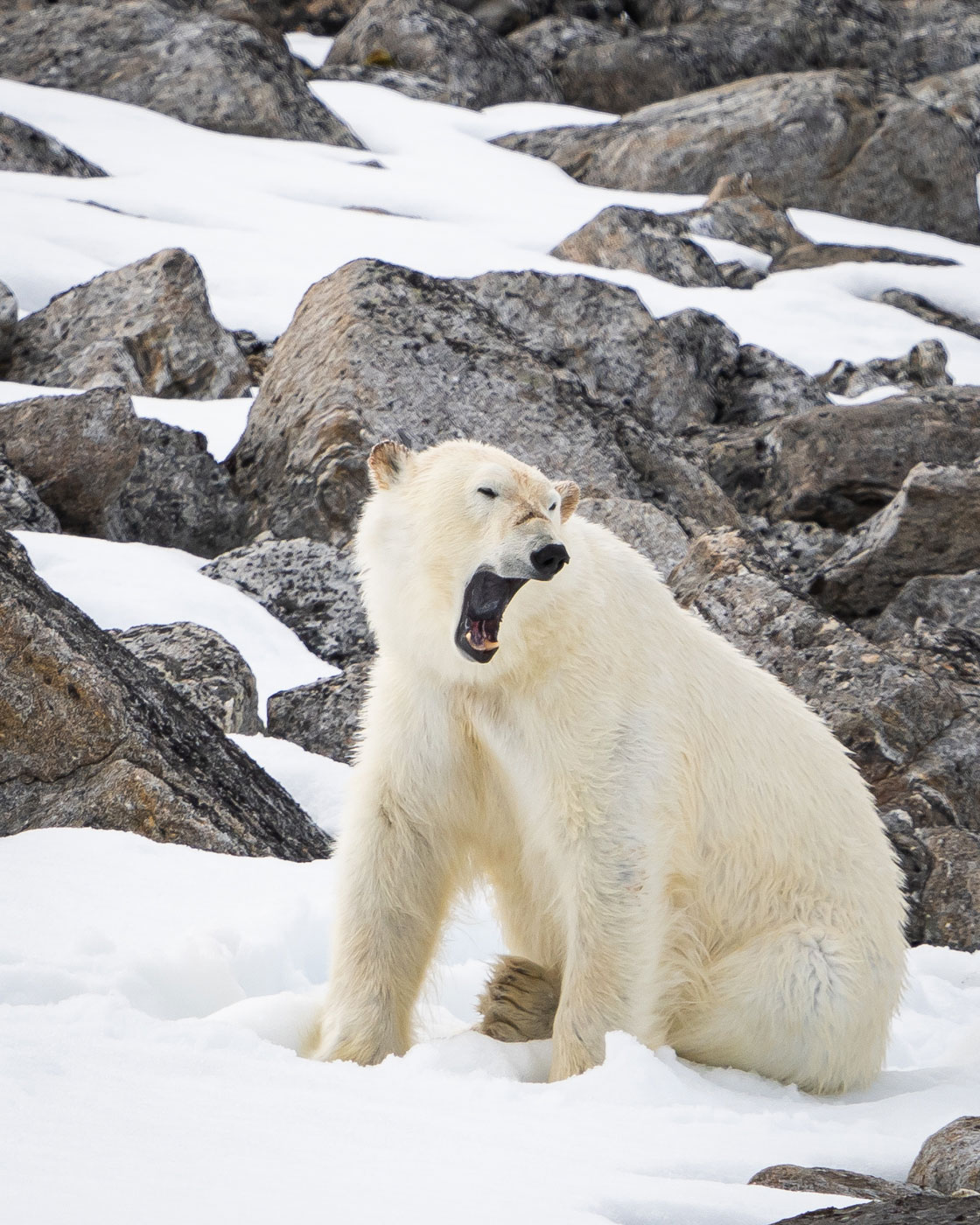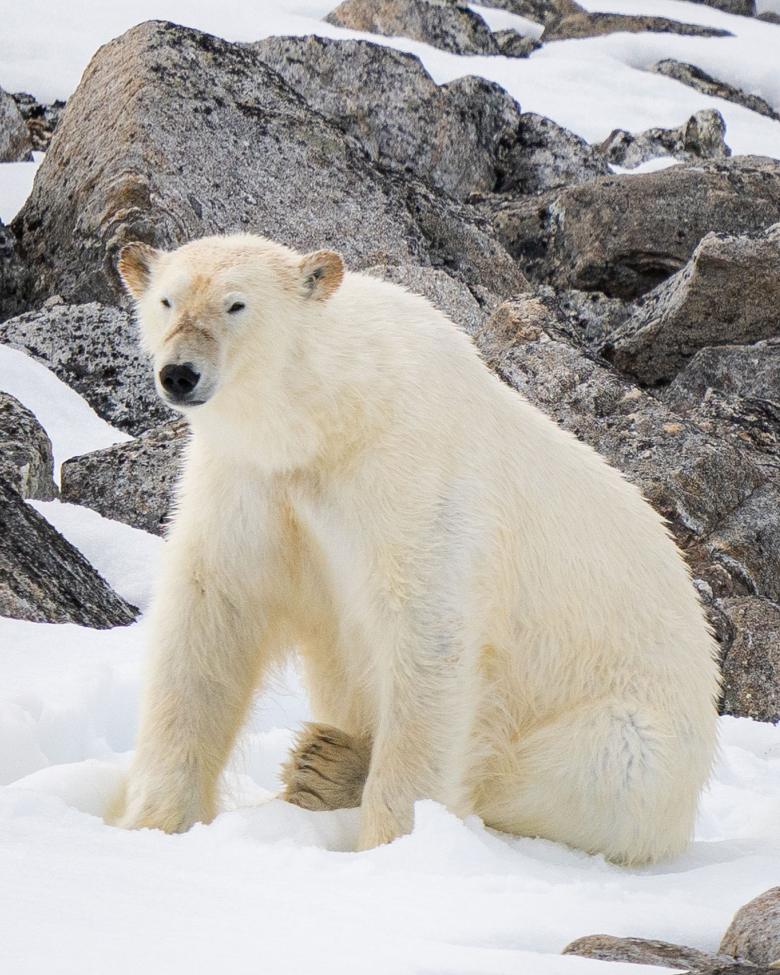 Es war erneut früh am Morgen, als wir die Durchsage erhielten, dass ein weiterer Eisbär an Land gesichtet wurde. Ich war gerade auf dem Weg ins Fitnessstudio, und in kurzen Jogginghosen fotografierte ich, was das Zeug hielt.